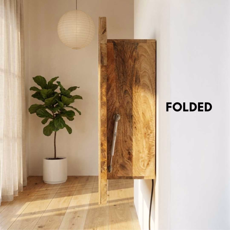Itβs crafted from solid acacia wood and designed to maximize space through a smart foldable mechanism.