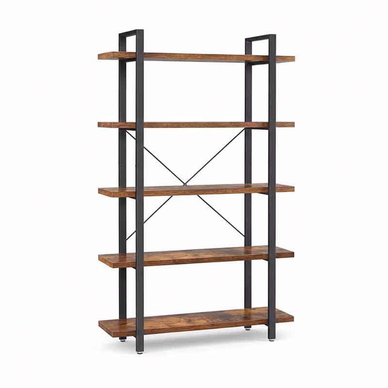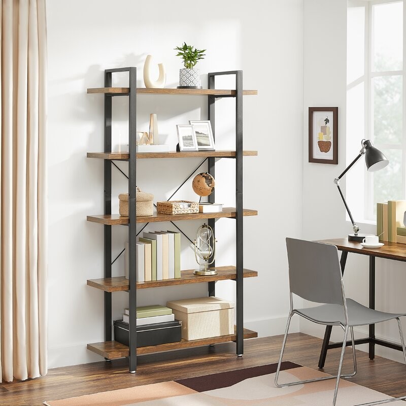 The angular bookshelf is crafted from premium solid wood shelves supported by a durable angular metal frame for strength and stability.
