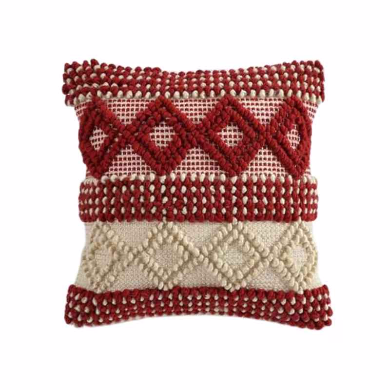 Elevate your home décor with this exquisite Artisan Woven Accent Pillow. Each piece is lovingly handcrafted on a traditional pit loom, resulting in a uniquely textured 18x18 inch cushion. The striking red and cream geometric design, woven from high-quality cotton, adds a touch of artisanal elegance to any space. This throw pillow's distinctive texture and eye-catching pattern make it a perfect accent for your sofa, bed, or favorite reading nook. Experience the beauty of traditional craftsmanship with this stylish and comfortable cushion.