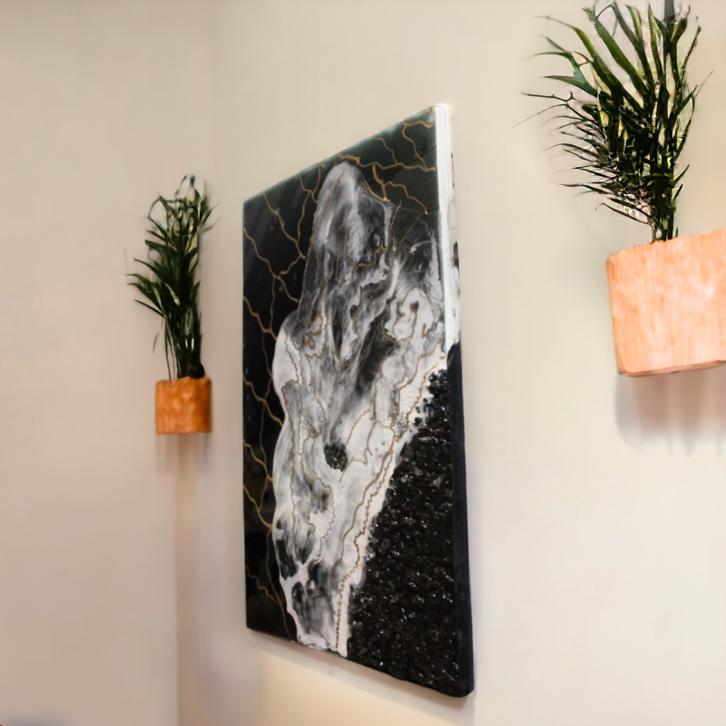 This wall painting matches both modern and traditional styles with its classic beauty and opulent appeal. With this gorgeous Black and Golden Epoxy Resin Wall Art, you can add a touch of class and elegance to your interior design and create a room that really captures your individual sense of style.