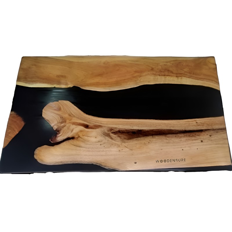 Important characteristics : Impressive Black Epoxy resin Resin River The table's centerpiece is a sleek, stylish black epoxy resin river that produces a dramatic, eye- catching print. This design element enhances the wood's natural beauty by giving it more depth and smoothness.
