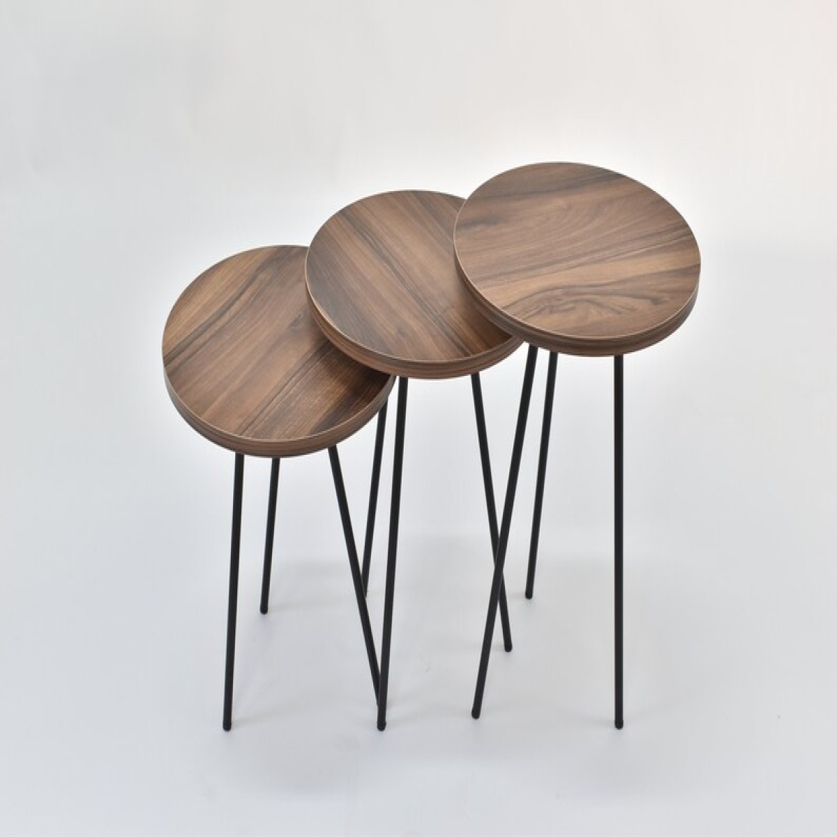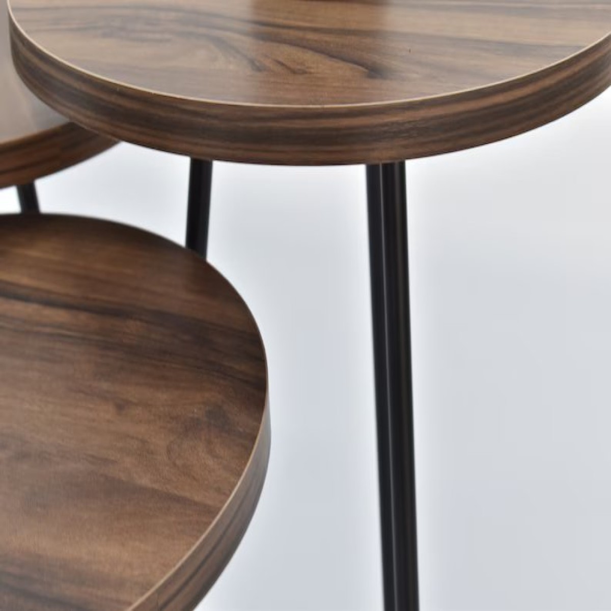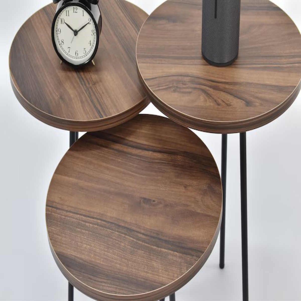 Here's a refined description for the Circlet Round Solid Wood and Metal Frame Nesting Table Set of 3:Here's a refined description for the Circlet Round Solid Wood and Metal Frame Nesting Table Set of 3: