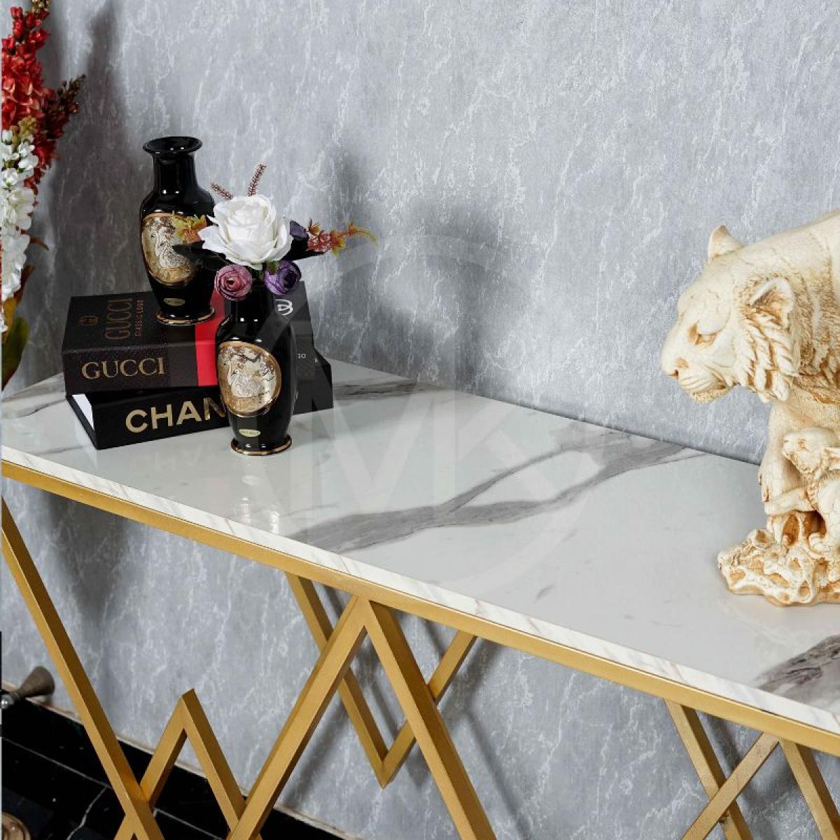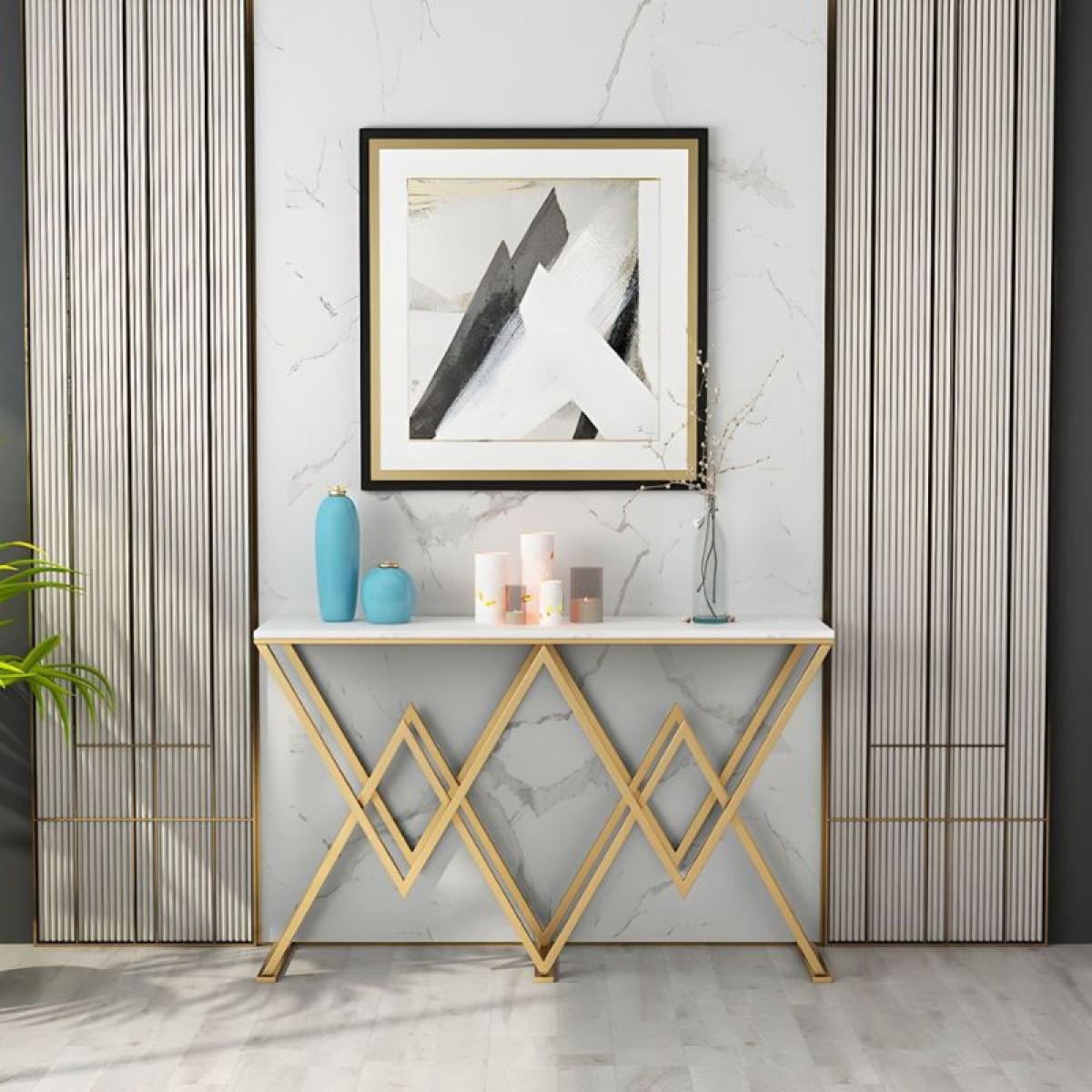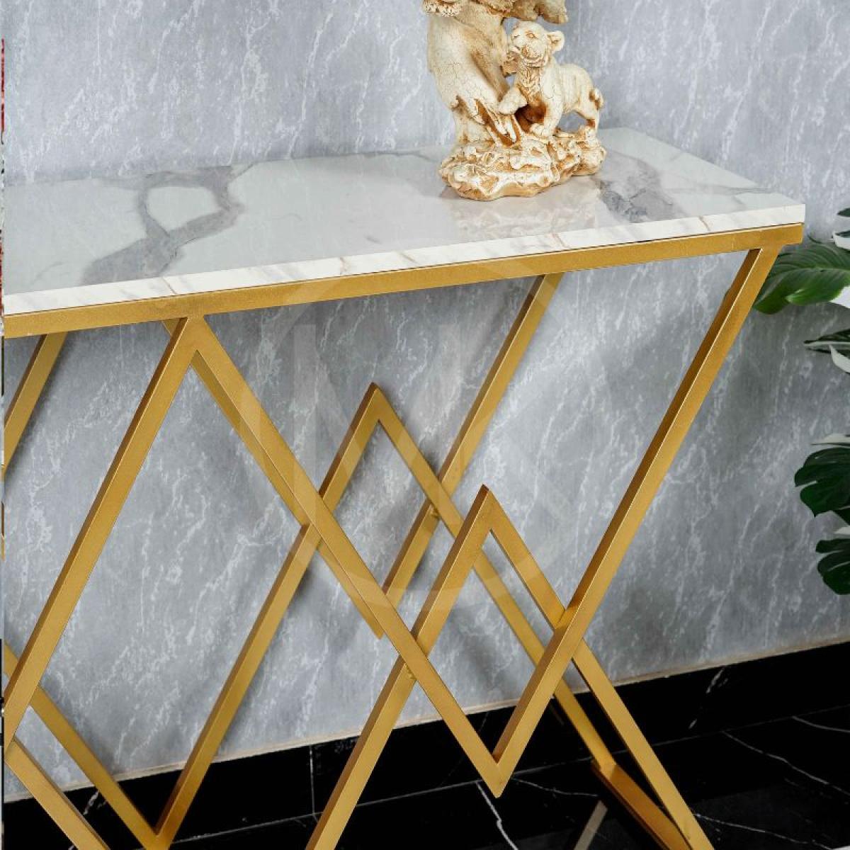 The Diamond Axis Console Table is a perfect example of geometrical accuracy, inlaid in finesse and opulence. With a diamond pattern at the base and a golden finish, this table provides the class and the new-age look to the home. The burly, yet creative base holds a shiny, emulation marble top surface, making it both practical and glamorous. Whether used to display beautiful ornaments, flowers or precious mementos, this console table turns your home into a true art gallery.