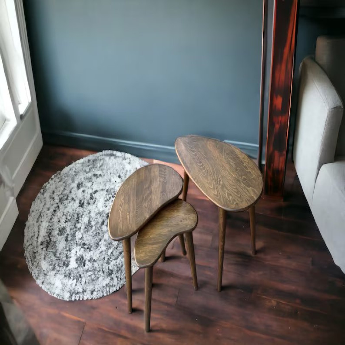 Design: Every table from the set has a unique base size, which makes it possible to put them together to save the space, or to use separately as bedside tables.