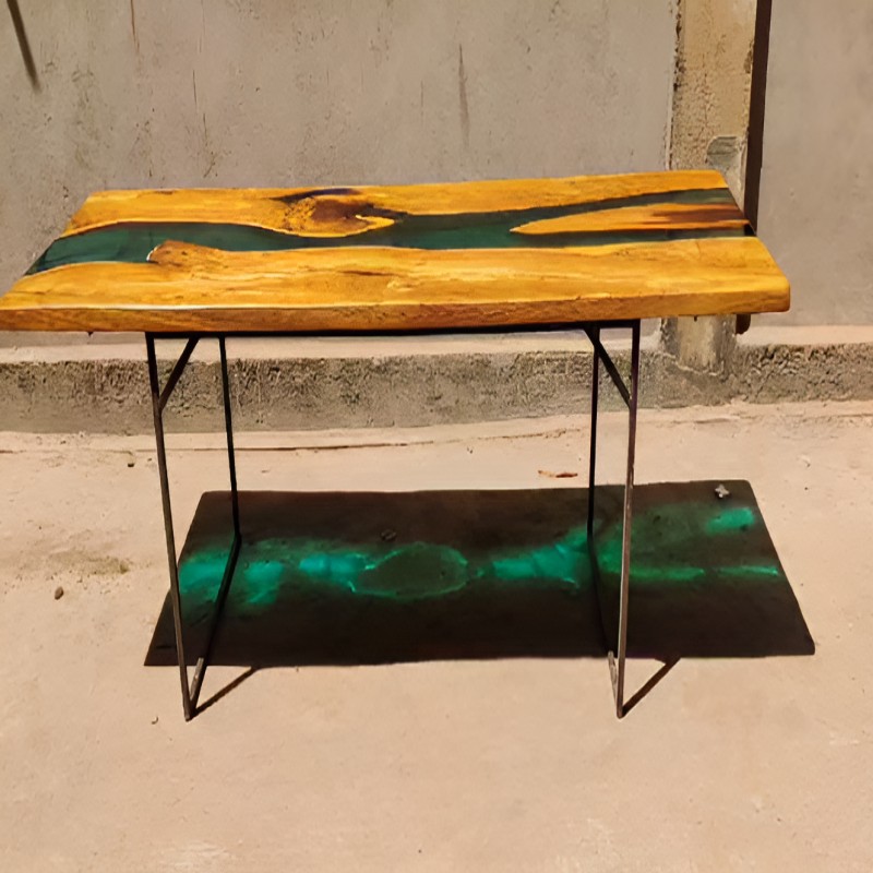 It is handcrafted from solid acacia wood and premium teal (bottle green) epoxy resin with a powder-coated metal base.