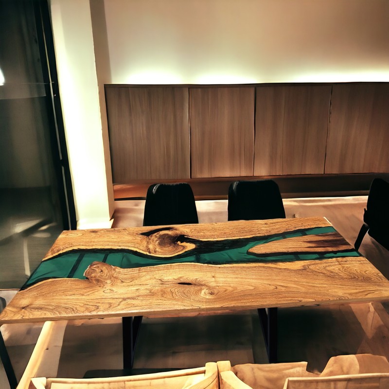 An epoxy resin dining table combines solid wood with colored or clear resin for a durable, non-porous surface with unique visual depth.
