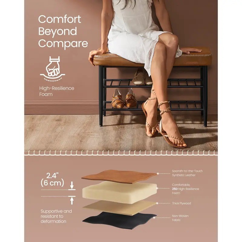 Blending elegance with everyday functionality, this entryway storage shoe bench features a premium synthetic leather seat in a warm caramel brown tone, detailed with refined stitching that adds a luxurious touch to your space. Designed for both comfort and practicality, its cushioned top is crafted with high-resilience foam for lasting support while you prepare for the day.