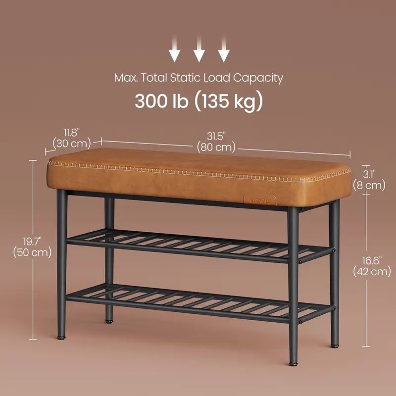 This shoe bench is made from premium solid wood with durable stainless steel legs and a cushioned synthetic leather seat for strength and comfort.