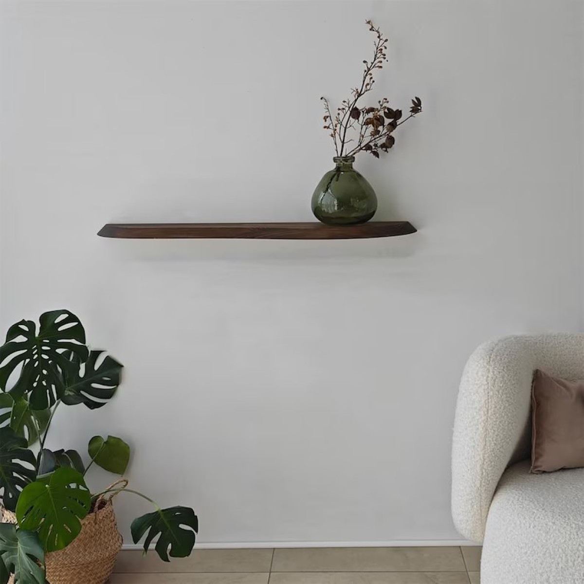 A live edge floating shelf is a wall-mounted wooden shelf that retains the natural edge of the wood, giving it a rustic and organic look. It's designed to appear as if it's "floating" without visible brackets or supports.