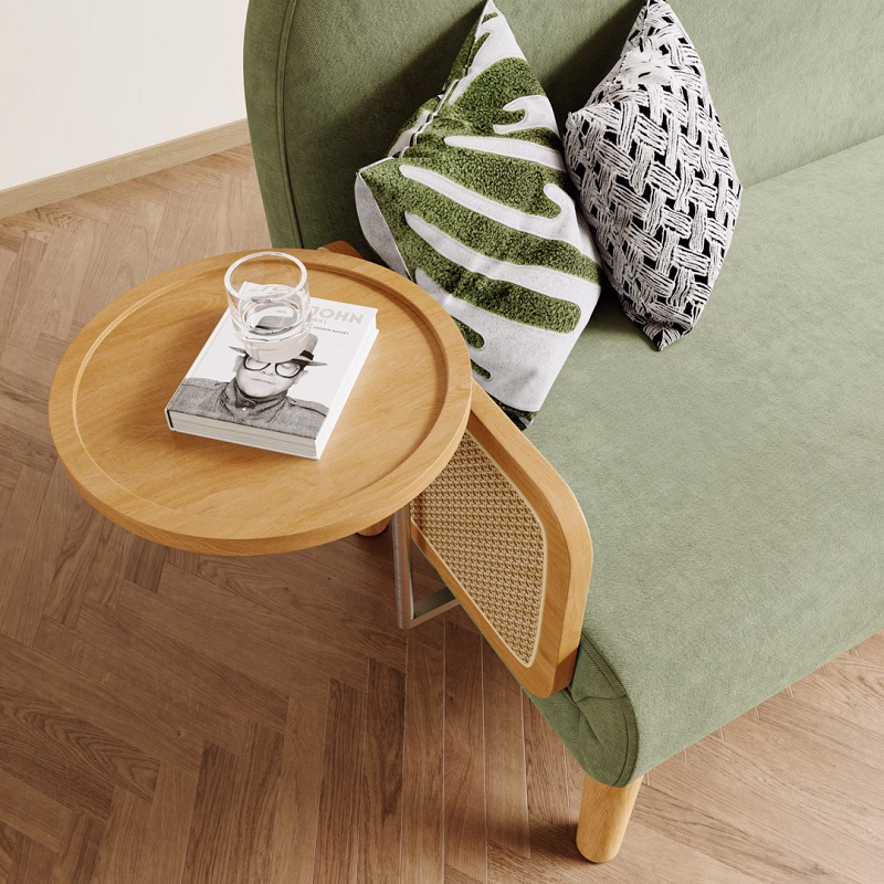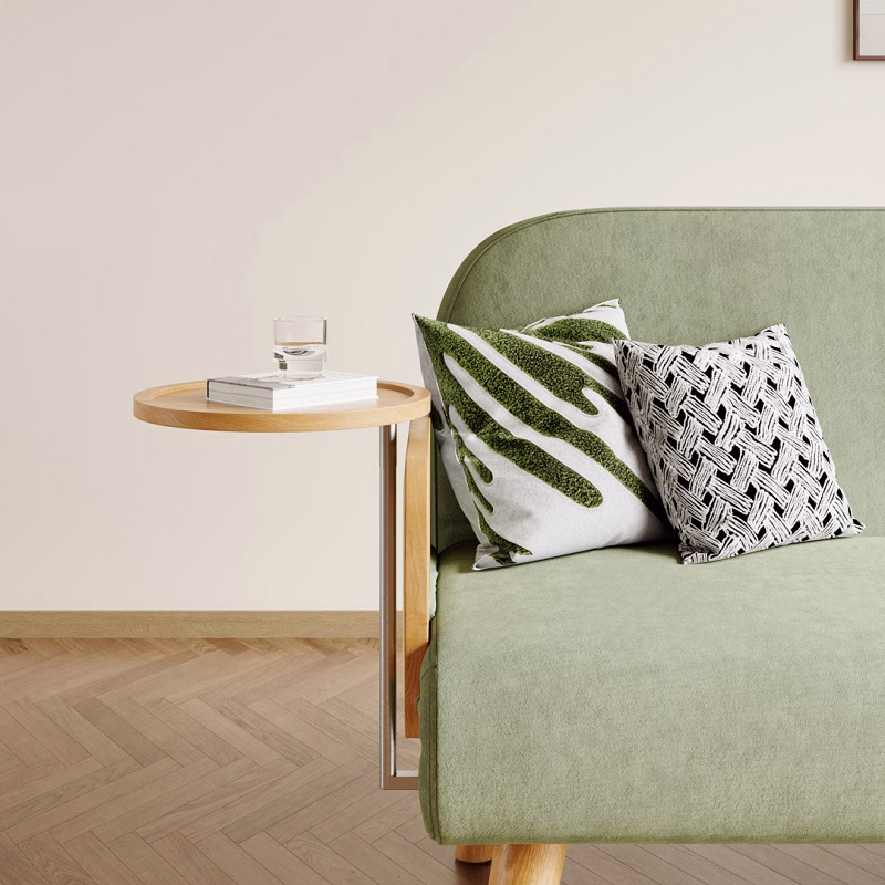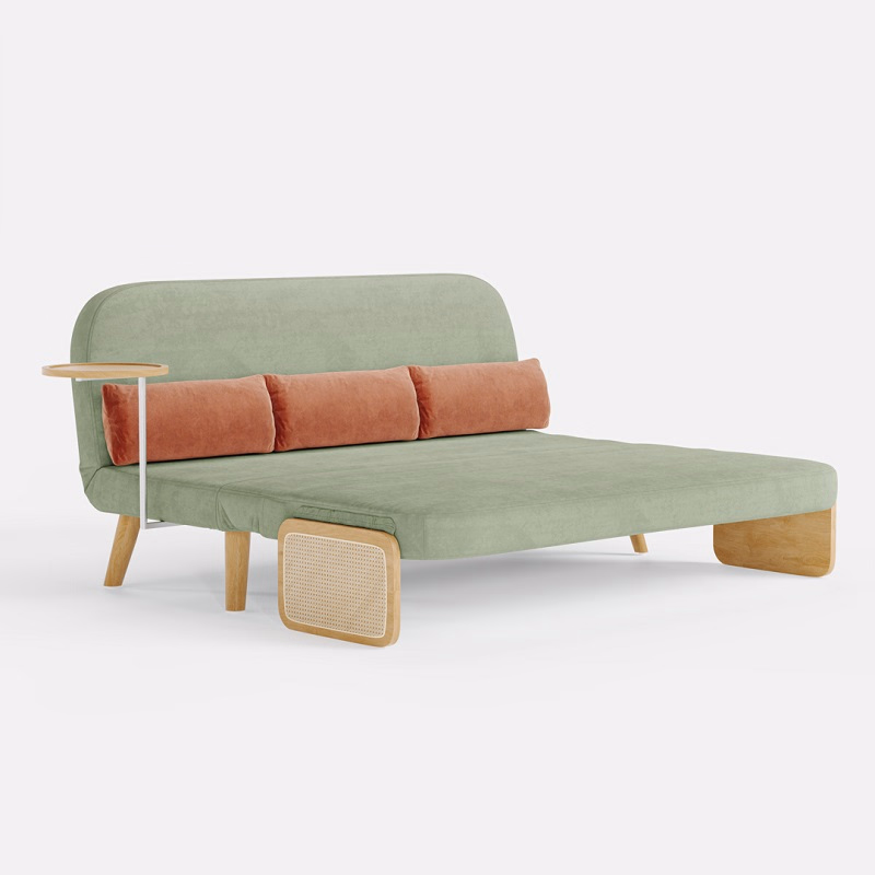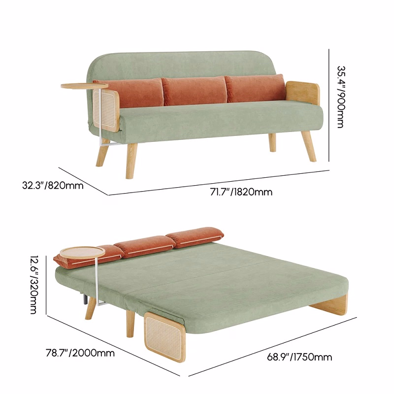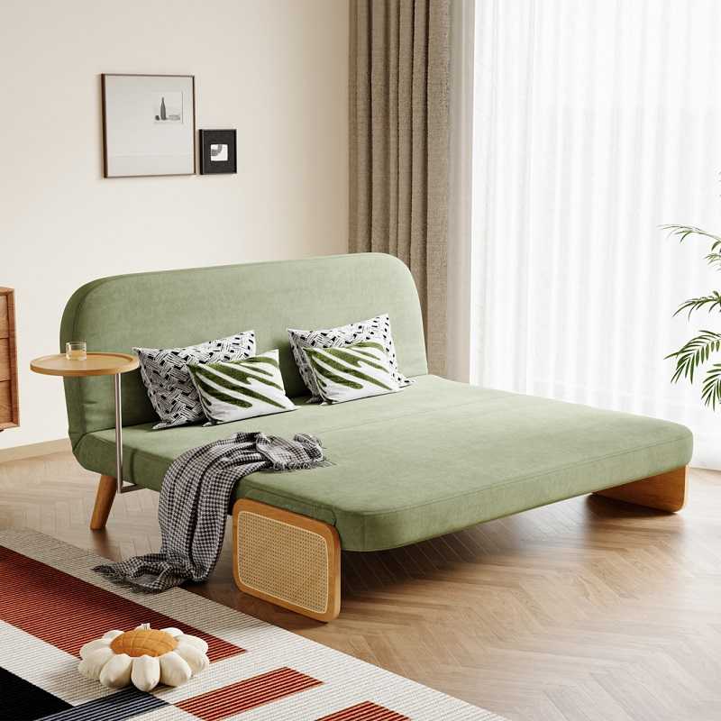 Upholstered in a rich green tone, this sofa adds character and freshness to living spaces, while the rattan detailing enhances its mid-century modern appeal. Built on a durable wooden frame, this 3 seater wooden sofa cum bed couch offers stability and long-term comfort. The integrated wooden side tray adds everyday convenience, providing space for drinks, books, or décor.