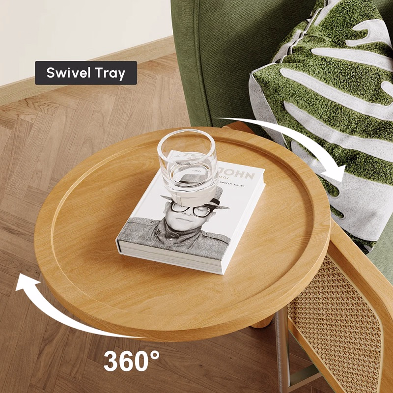 Yes, it features an integrated wooden side tray for placing drinks, books, or everyday essentials.
