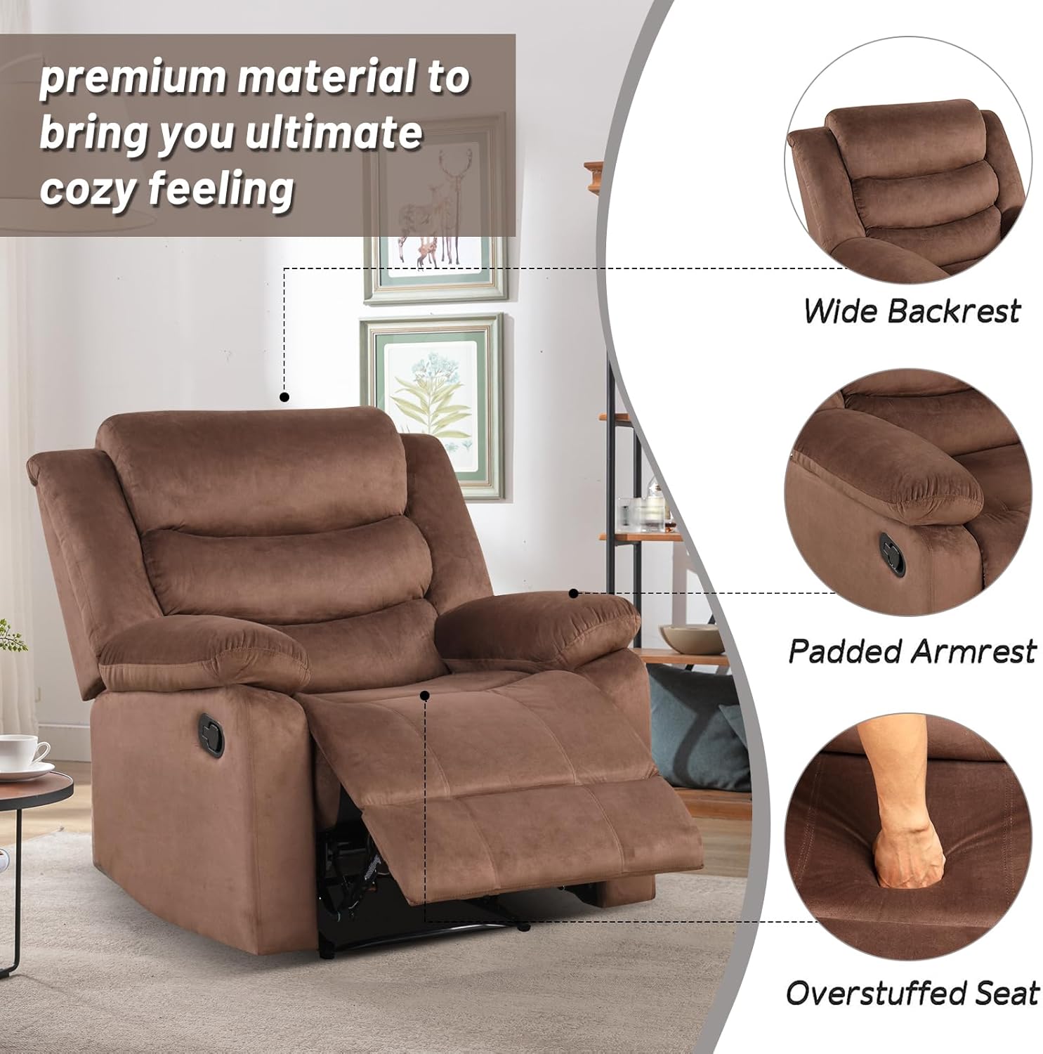 Wrapped in high-quality suede, the recliner offers a breathable, plush, and inviting texture that enhances every sitting experience.