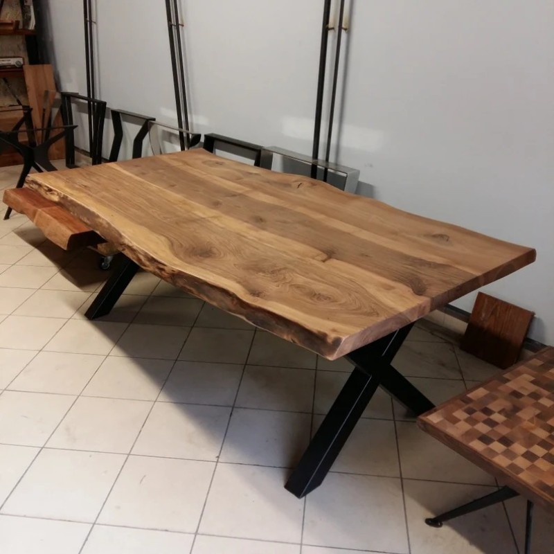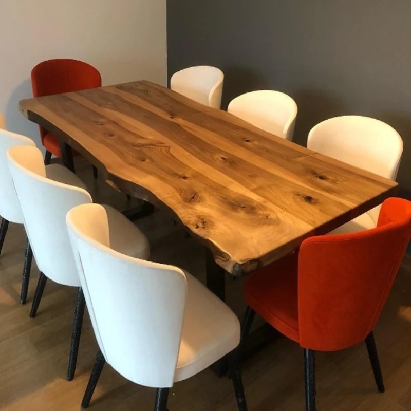 Elevate your dining space with this premium handmade solid wood live edge dining table. Crafted from high-quality natural wood, it features a smooth, polished surface that highlights the unique grains and textures of the timber. The table is supported by a sturdy metal base in a minimalist design, providing durability while complementing the rustic charm of the wood. Its natural finish enhances the organic aesthetic, making each piece one-of-a-kind.