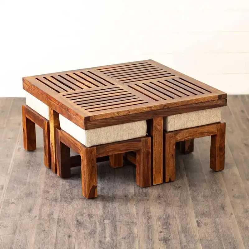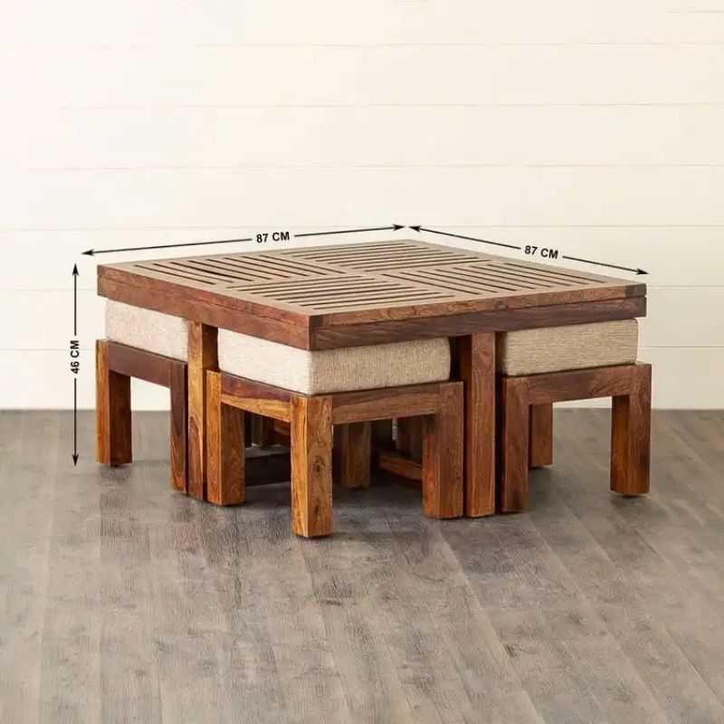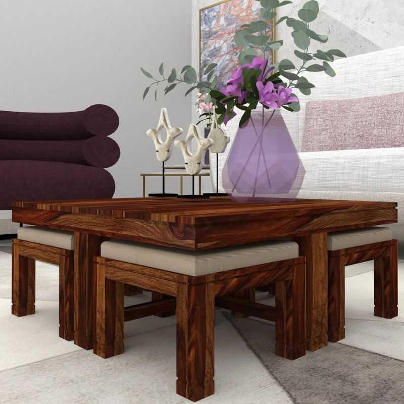 Upgrade your living space with the HeritageAura Sheesham Wood Coffee Table Set by Woodensure. This coffee and center table combo includes 4 cushioned stools that tuck in perfectly, making it ideal for space-saving needs in modern apartments or villas.