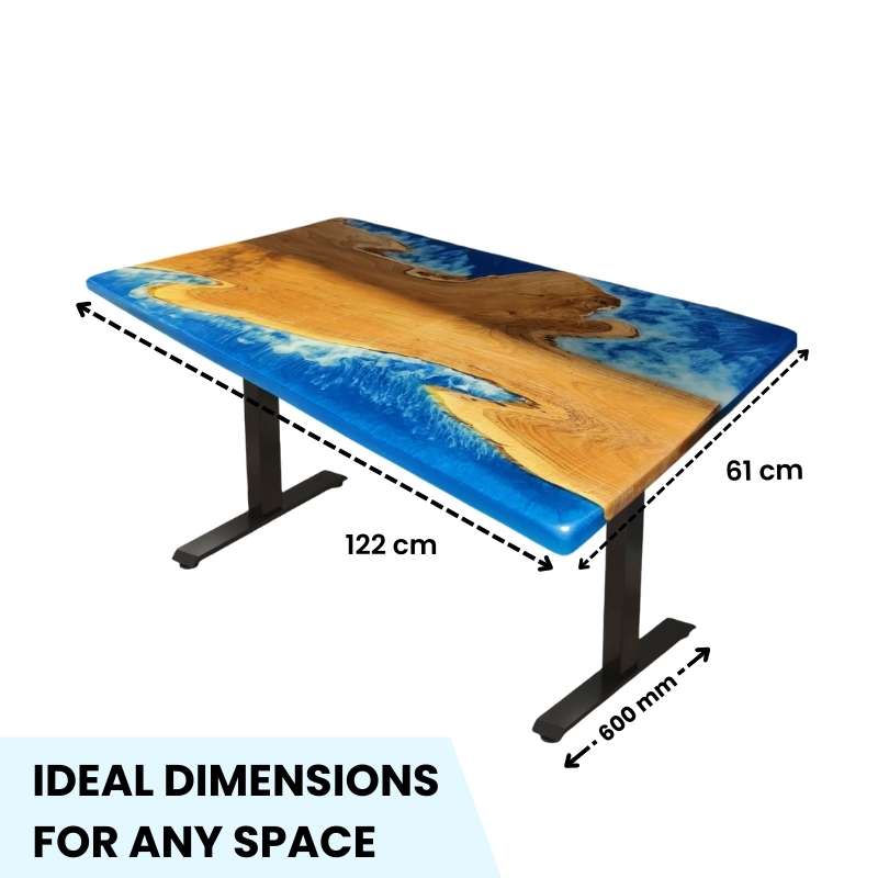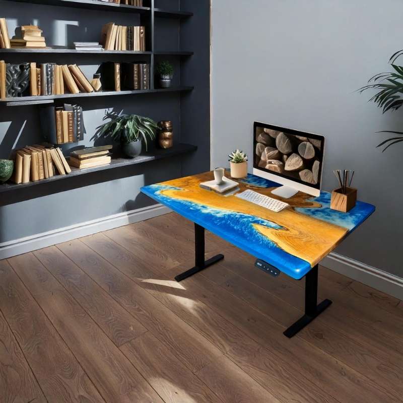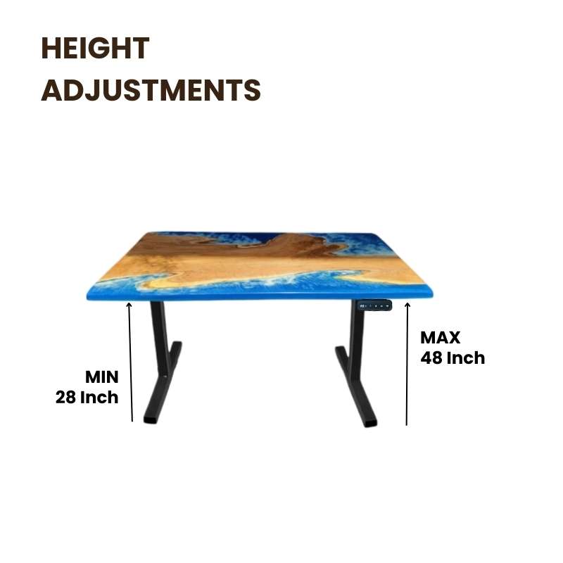This standing Desk, a 48-inch blue beach island epoxy wood table with a height adjustment option, is equipped with an electric motor that helps adjust height in no time. Electric sit & stand desk that is stylish, functional, and affordable. Crafted Options are available in solid wood. Up & Down Ergonomic Table has different designs and colors and a metal frame, this blue beach island standing desk is beautifully eye-catching and serves as a functional to complement your work environment for office and home needs.
