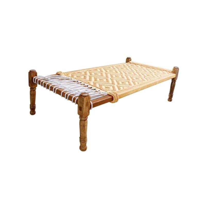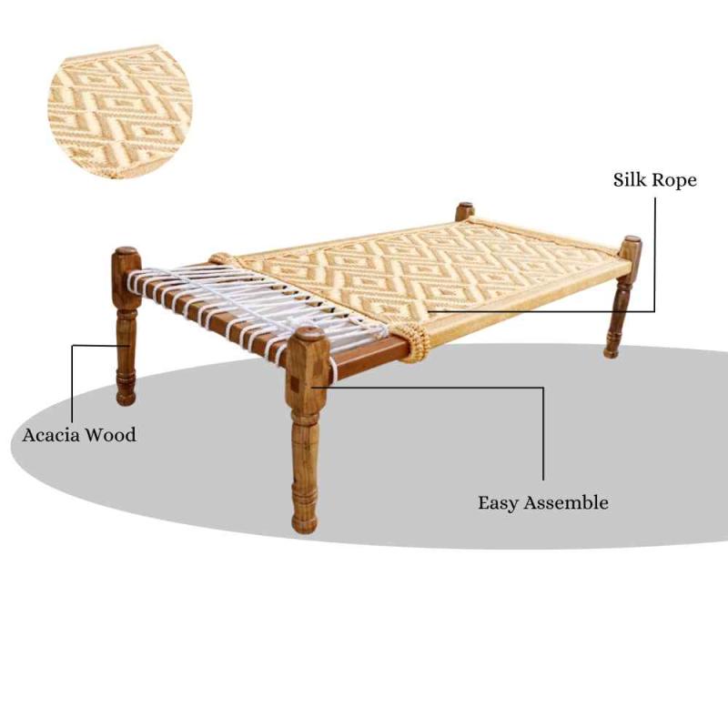 The Indian woven rope charpai is a special piece that has a technique used in almost all Indian homes. The base is made of acacia wood, while beautiful cream and white silk rope added to it make it look elegant and classy element, which coincides perfectly with the modern minimalist esthetic without looking too brutal. This is beautiful Indian Woven rope charpai which can be used to decorate your interior or exterior decor.