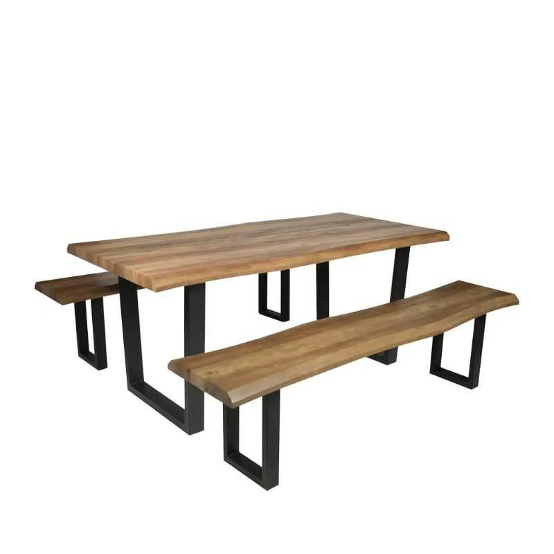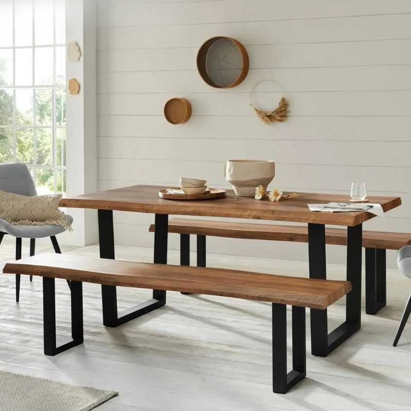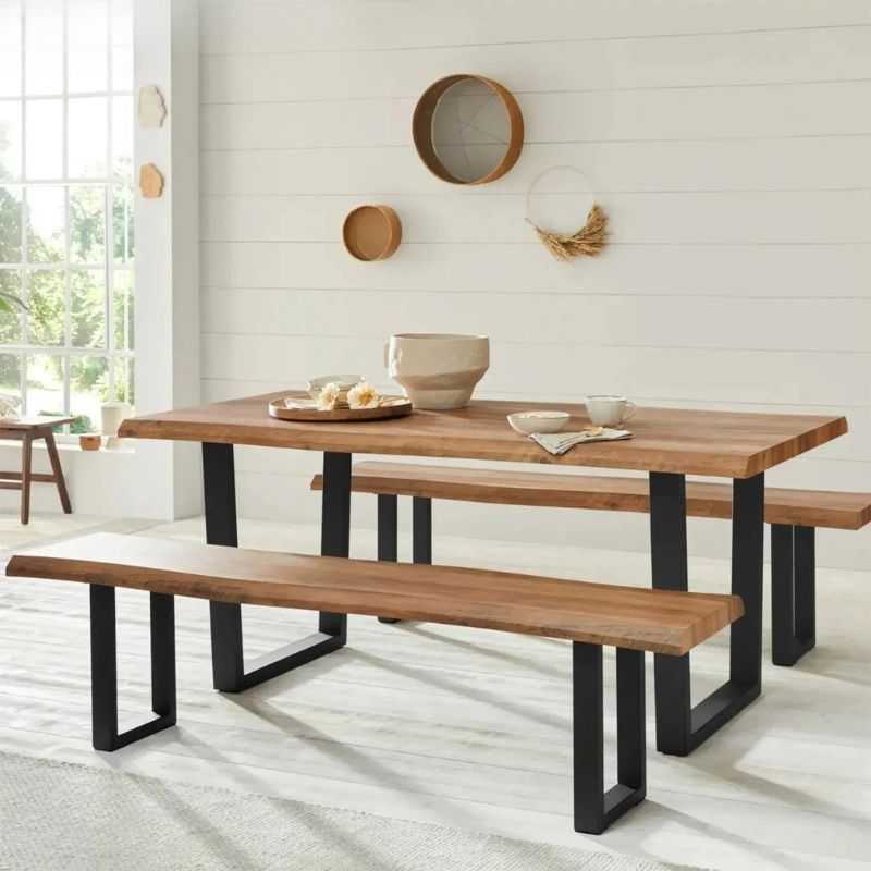 Elevate your dining space with this contemporary Acacia wood dining set with 2 bench, blending natural aesthetics and modern minimalism. Perfect for urban homes or statement dining rooms.