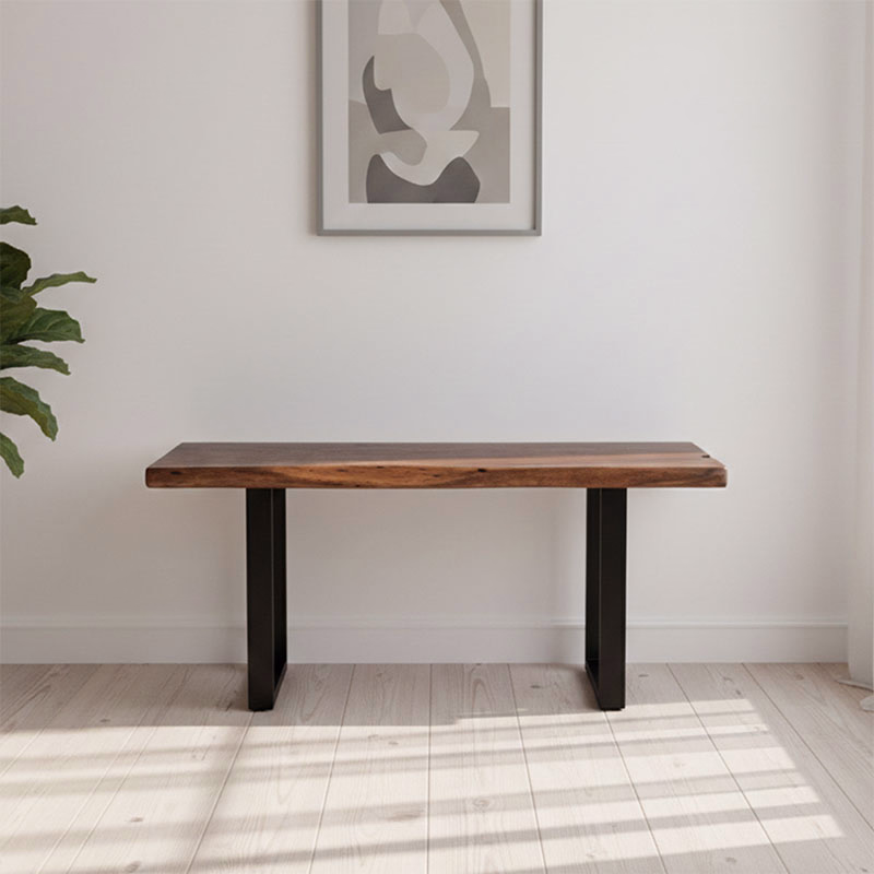 This live edge bench is crafted from solid Acacia wood and supported by a durable MS metal base frame with a black powder-coated finish.
