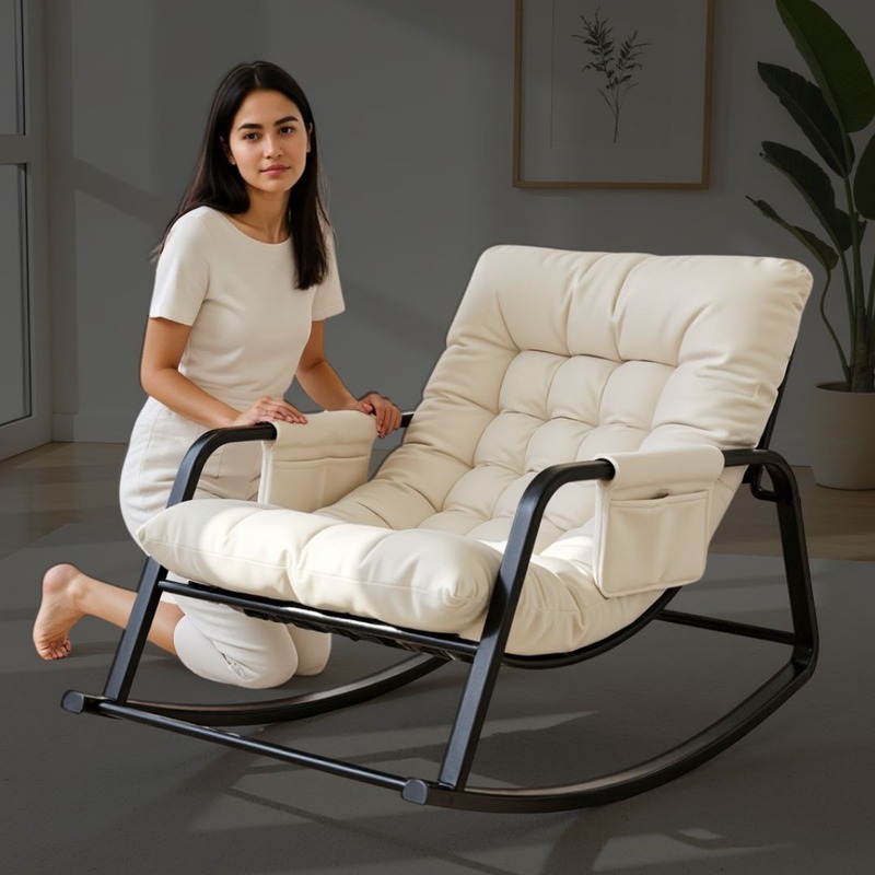 Our Modern Padded Rocking Chair combines the charm of a classic rocker with a sleek, contemporary design.Include a smaller secondary image showing details like the side pocket, cushion material, and rocking base. Whether you’re creating a serene reading nook or looking for the perfect accent piece, this chair is a versatile addition to any space." Include a smaller secondary image showing details like the side pocket, cushion material, and rocking base.