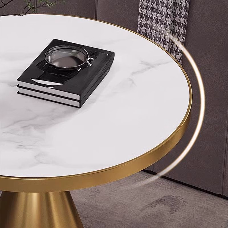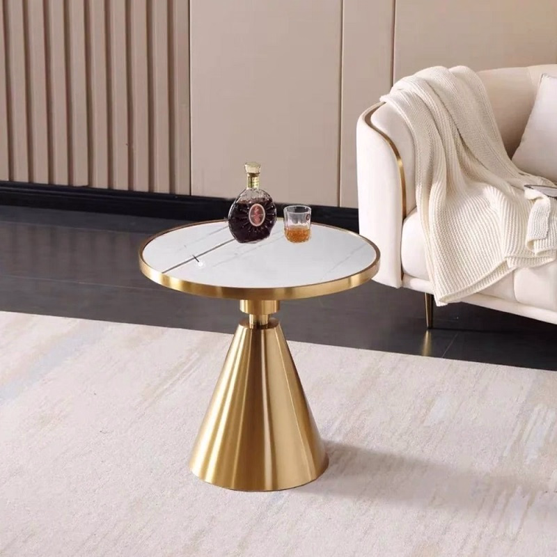 It features a white marble tabletop with a golden powder-coated stainless steel base.