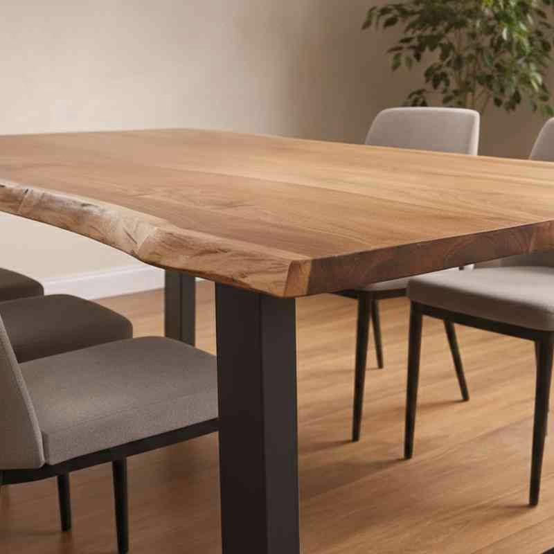 The Novellum Dining Table is crafted from premium acacia solid wood with a natural grain finish, paired with sturdy black metal legs for durability and modern style.