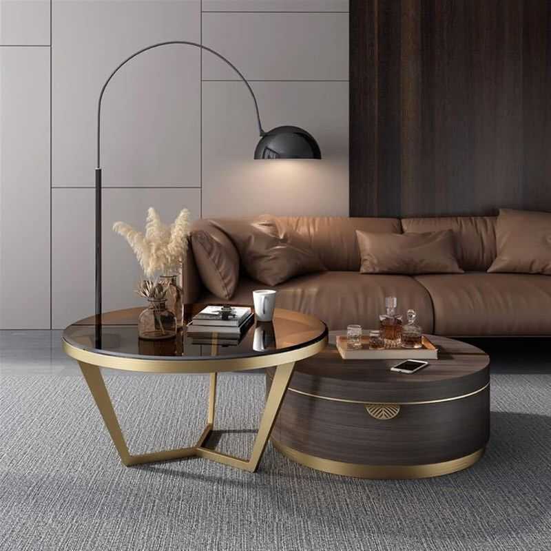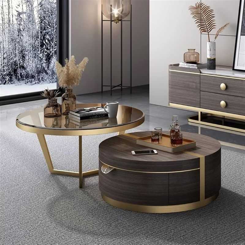 With its versatile design, this modern center table set offers ample surface space and a hidden compartment for essentials, combining style with practicality. The gold accents and rich tones make it a stunning focal point in your space.
