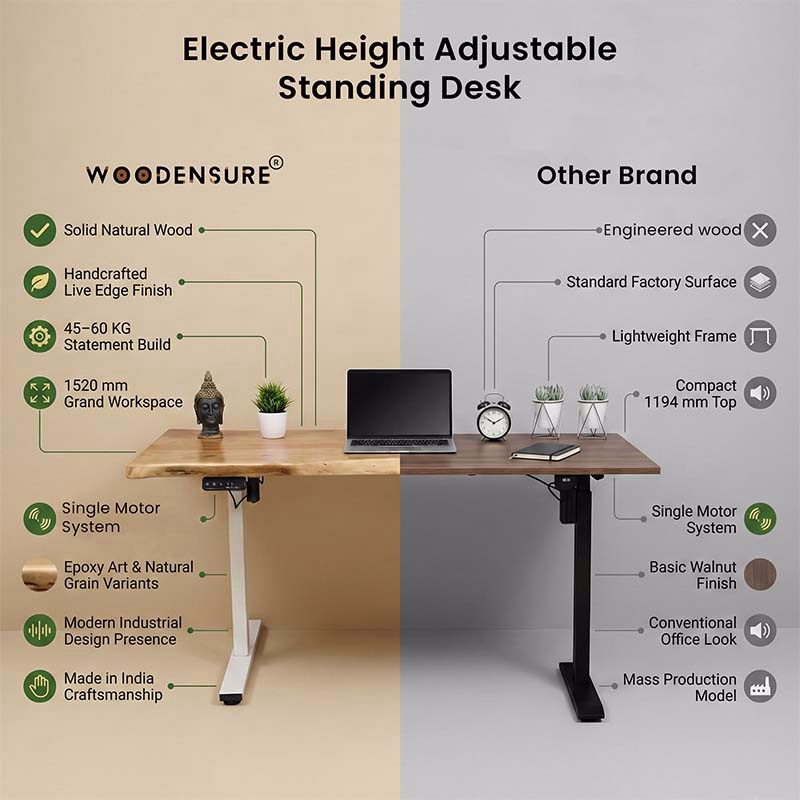 At Woodensure, we put quality, design and customer satisfaction first. Our desks are made from high-quality materials such as hardwood, epoxy resin and MDF to ensure durability and beauty. We offer a variety of styles and finishes to suit everyone’s needs, and every piece is designed with ergonomic comfort in mind, helping to improve your posture and productivity.