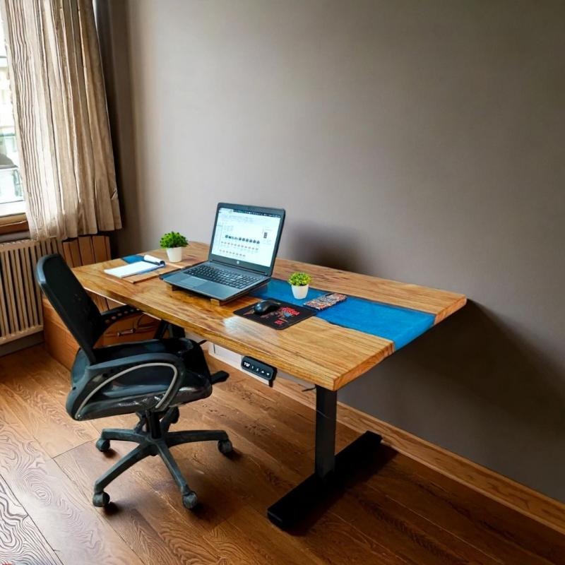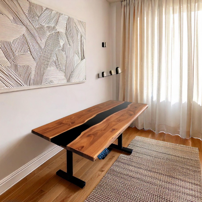 Designed with a river-like elevation, a translucent black epoxy wood top standing desk is a perfect combination of classically inspired and technologically advanced workstations. In terms of aesthetics, this type of furniture can be highly appealing, and in terms of practicality, it affords a fascinating and productive work environment.