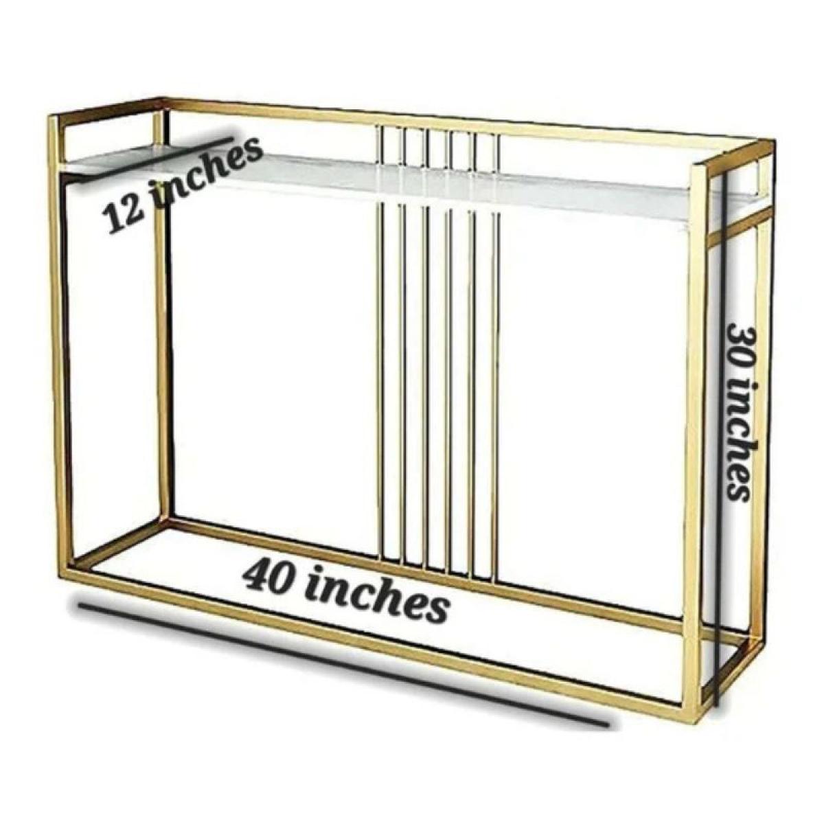 Made to inspire and be the centerpiece of attention – welcome the Opulent Golden Console Table into your home. This is a black marbled top table with an impressively carved gold frame and adds a charm of elegance to the room. Having a geometric form and a sturdy structure, it is a model of contemporary design that will suit both modern and traditional interiors. A great addition to your entry or living room or even hallway, this console table is perfect for additional surface space for accessories, décor, and even vases. Update your living space with this stunning accessory which will enrich your interior design yet enhance the feel of any room.