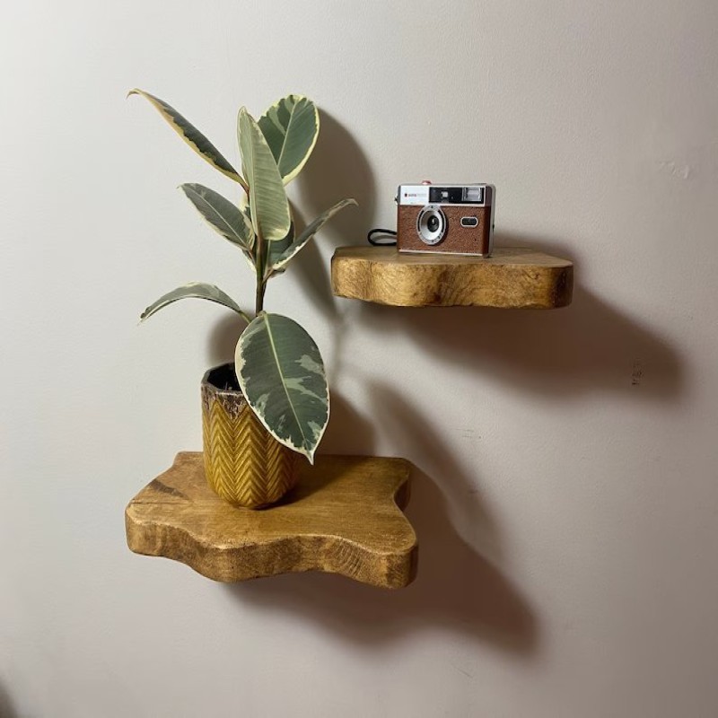 A live edge floating shelf is a wall-mounted wooden shelf that retains the natural edge of the wood, giving it a rustic and organic look. It's designed to appear as if it's "floating" without visible brackets or supports.