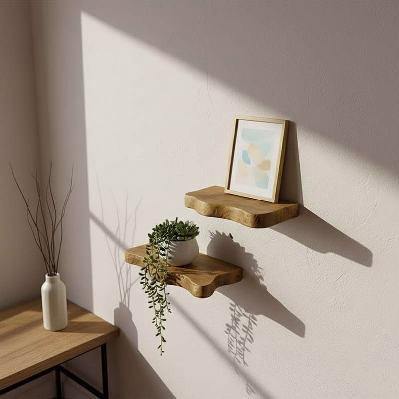 Installing floating shelves is straightforward with the right tools and technique. Here's a step-by-step guide: Gather Tools and Materials Drill Level Measuring tape Pencil Wall anchors (if not drilling into studs) Screws and brackets (provided with the shelf) Choose the Location Decide where you want to install the shelf. Use a level to ensure it's straight and mark the placement on the wall with a pencil. Find Wall Studs Use a stud finder to locate wall studs for a secure installation. If studs aren’t available, use wall anchors suitable for your wall type (drywall, brick, etc.). Mark the Bracket Holes Align the mounting bracket with the pencil marks. Mark the screw holes on the wall through the bracket openings. Drill Pilot Holes Drill pilot holes into the wall at the marked points to make it easier to screw in the brackets or anchors. Attach the Brackets Secure the brackets to the wall using screws. Ensure they are tightly fastened and level. Mount the Shelf Slide the floating shelf onto the brackets, ensuring it sits snugly. Secure the shelf to the brackets if necessary (some designs include locking screws for added stability). Test the Stability Gently press down on the shelf to ensure it’s secure and level before placing any items on it.