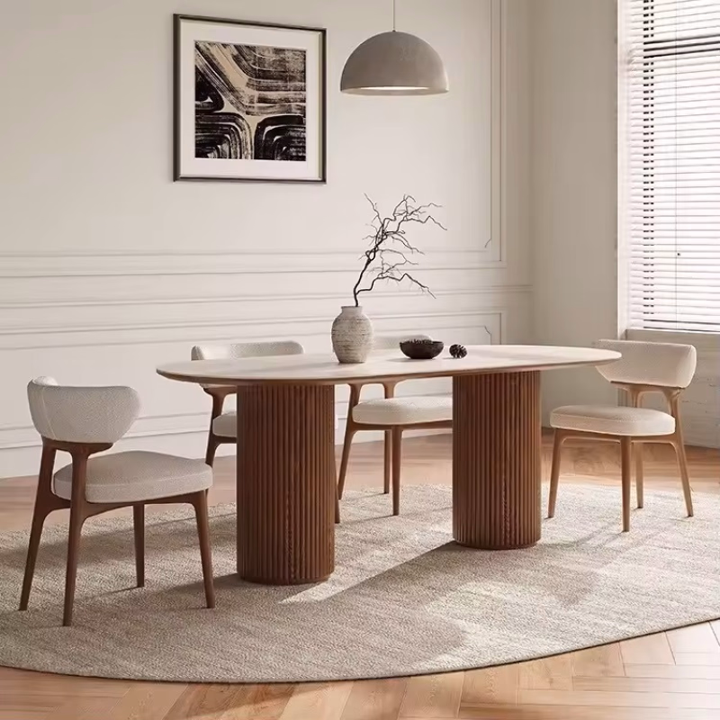 Supported by dual wooden pedestal bases, this dining table provides excellent stability while maintaining generous legroom. The natural marble and wood tones seamlessly complement contemporary, minimalist, and Scandinavian interiors, making it a versatile choice for modern homes.