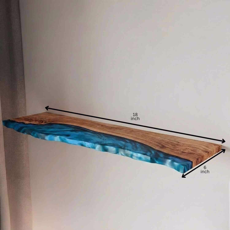 Let's talk about the "Peacock Blue Epoxy Resin Live Edge Solid Wood Wall Shelf," the amazing product based on the reviving colors of the peacock feathers. This shelf features a live edge design with a sparkling in blue effect, that just blends in and remains equal on both home and office spaces. This shelf is an Indian style hand-made craft crafted by some of India's most talented carpenters, not only aesthetically pleasing, but functional as well after being mounted on the wall.