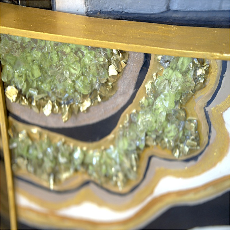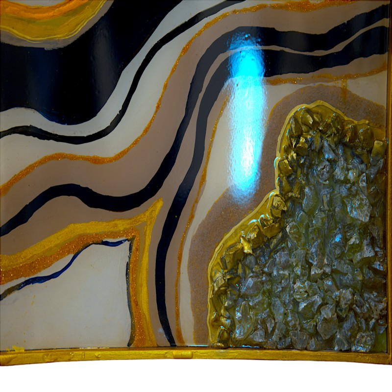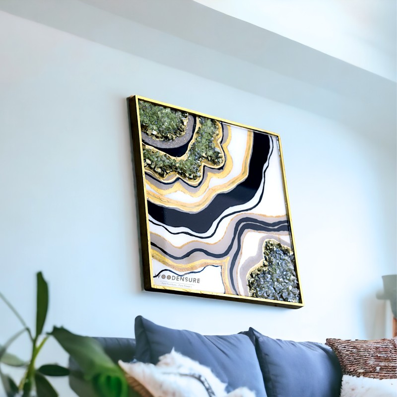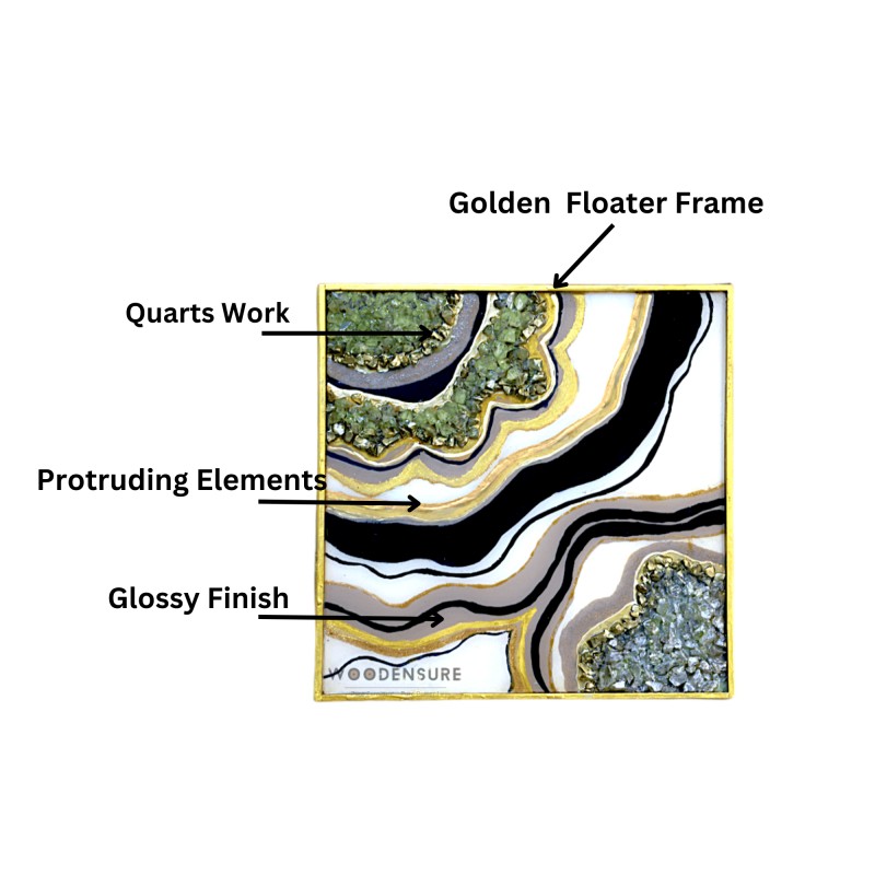 Curing and Finishing: To make sure that the resin carefully hardens and cures, the artwork is allowed to cure for a few days. After curing, the surface is finely polished to a beautiful sheen, highlighting the gorgeous luminosity of the quartz crystals underneath.