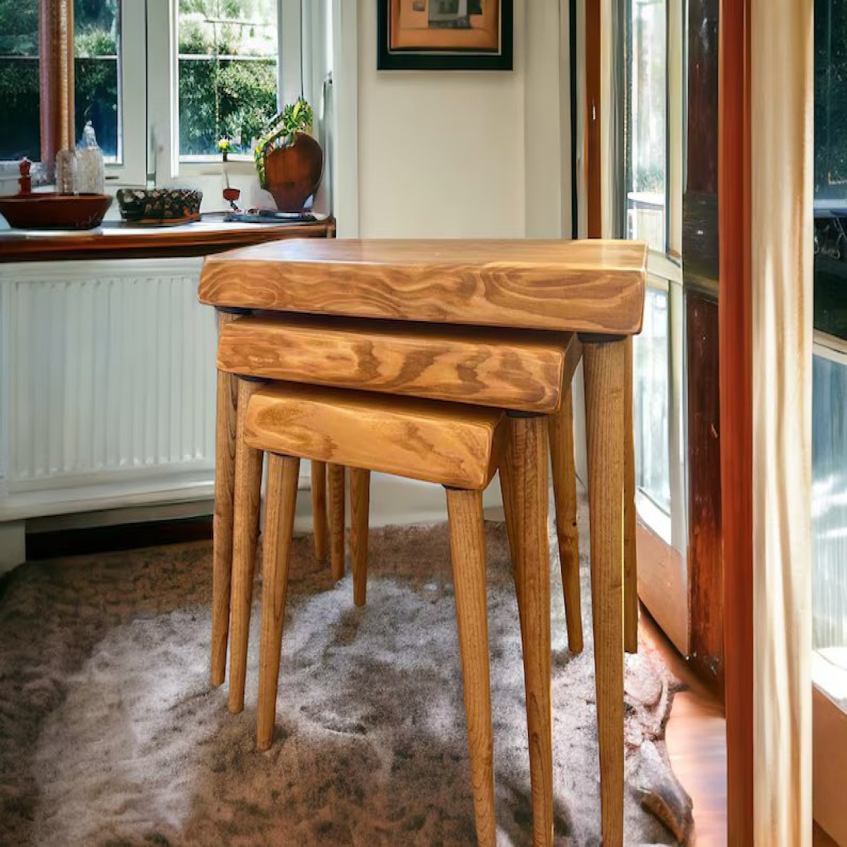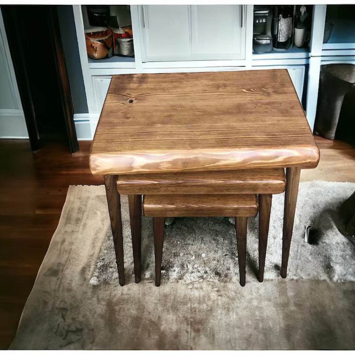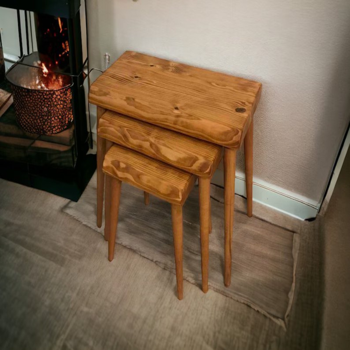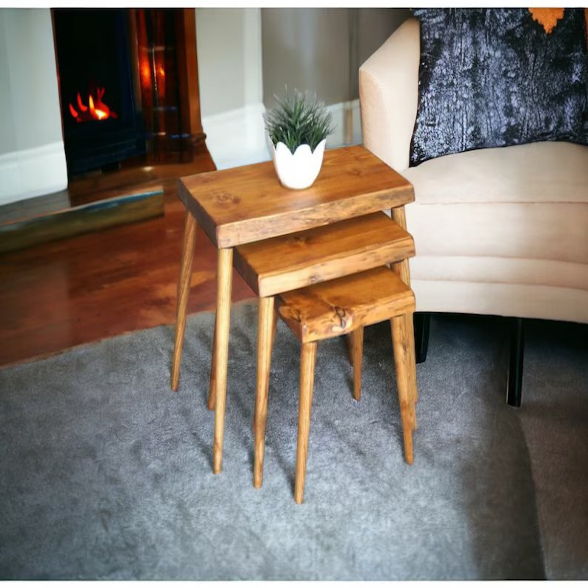 Aesthetic appeal: This is a Rhomboid Solid Wood Nesting Table Set of 3 Plectra Solid Wood Coffee Table exudes a blend of elegance and practicality. Their solid wood construction and timeless design add warmth and charm. The trio. Their adaptability makes them appropriate for living rooms, bedrooms, home offices, and even outdoor spaces such as patios or balconies.