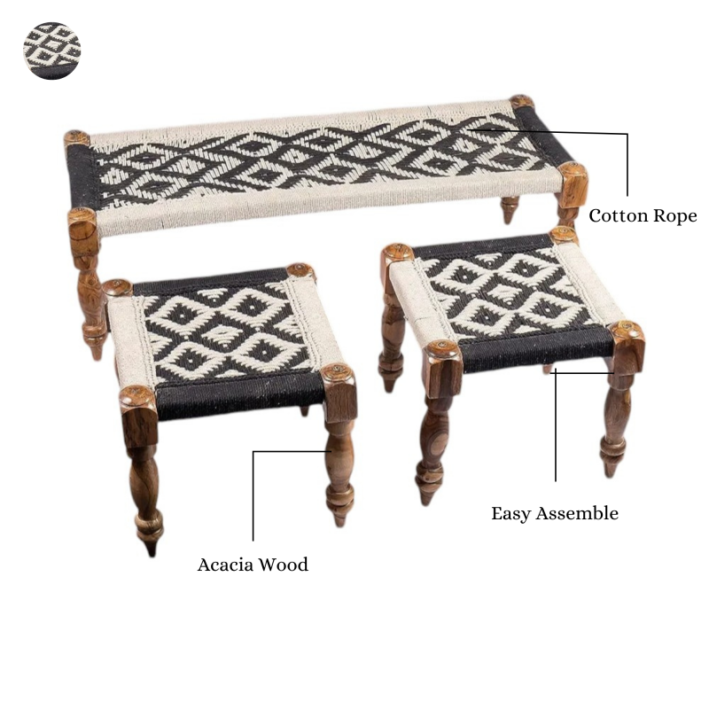 The black and white rope bench with stool set of 2 is a beautiful and classic piece you will not regret buying. The material used in the construction of the rope will not be degradable due to weather and the frame is made of robust acacia wood. The convex geometric design of the backrest enhances comfort while the versatile colour option blends nicely with most ambient outdoor environments. Whether for the patio, the garden, or any outdoor area, this rope bench with stool set of 2 is perfect to complete the living spaces in your home.