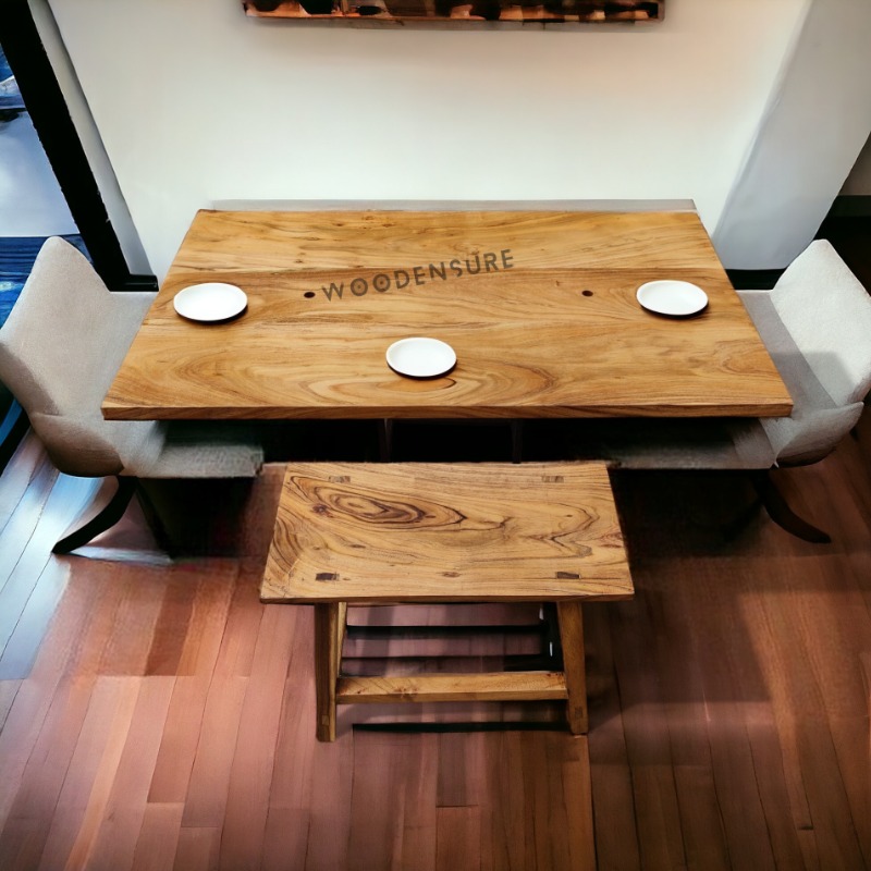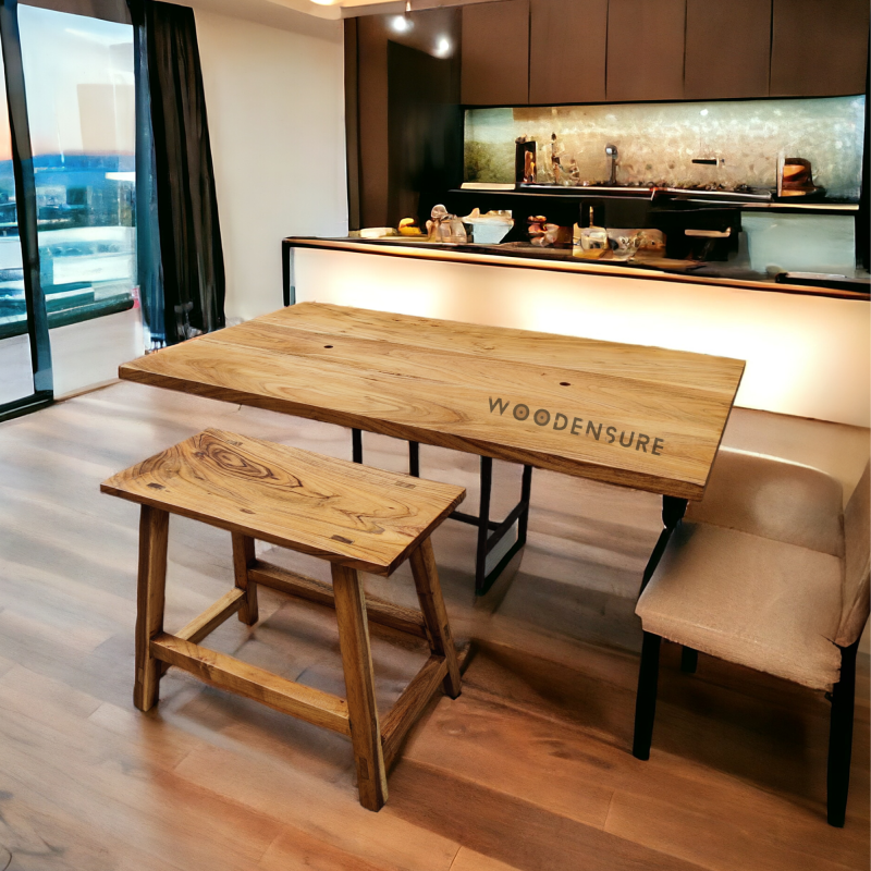Rustic Harvest Solid Wood Dining Table Style It is made in a classic rectangle design, giving the Rustic Harvest Solid Wood Dining Table a timeless appeal and versatility. Material This table is made with top-quality Acacia solid wood, highly known for its durability, unique grain pattern, and rich natural tone. Tone: The color of the Acacia wood contributes to the warmth and character of your dining room, making it inviting and pleasant. Base Frame Material: Supported with 1.5 feet high sturdy wooden legs, the table's base frame complements the natural wood top to give it stability and a cohesive look. The Rustic Harvest Solid Wood Dining Table is much more than a functional furniture piece for its owners. It's a statement of style and craftsmanship. Its organic beauty, durable materials, and classic style set it apart for special dining occasions, whether for intimate meals or extended family gatherings. Finish The table features a semi-gloss finish that gives it elegance and protection on its surface. Top Thickness The thickness of the tabletop is between 1.15 to 1.5 inches, making the tabletop sturdy and substantial.