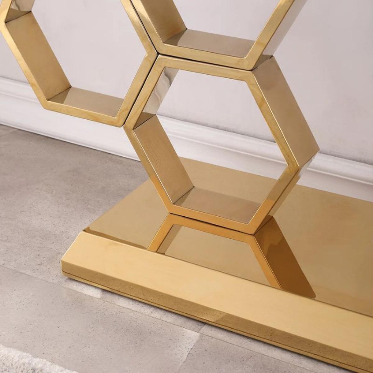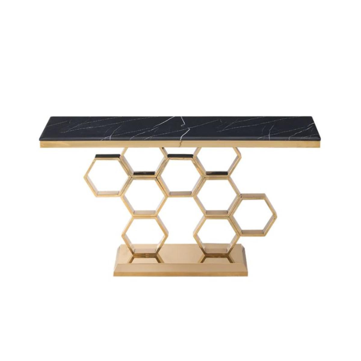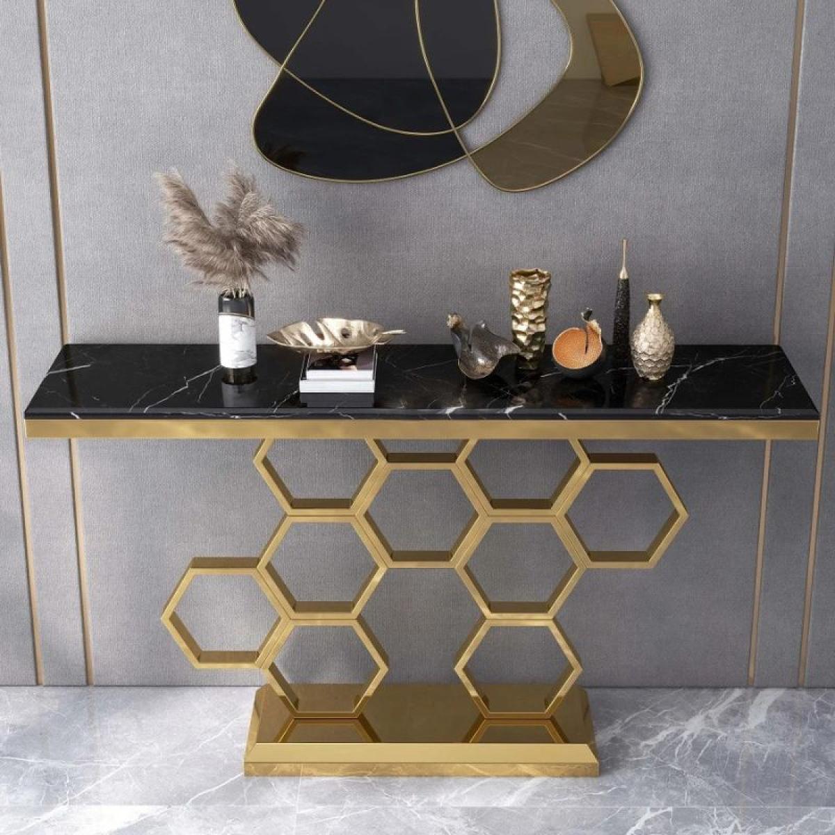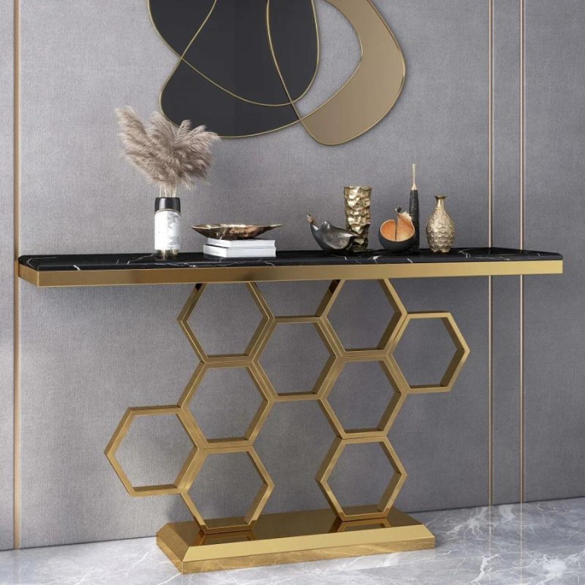 You can never go wrong with this Sleek Black and Gold Console Table, elegance and functionality all in one convenient furniture piece. This exquisite table has an exquisite black marble top and its intricate honeycomb gold base makes it more than just a table; it can be a conversation starter in the living room, hall-way entryway. The material used for the frame is gold, with geometry designs for a shining touch, and the design is also resistant and durable. This table transforms your aesthetics with its class and is meaningful to use for Décor, Picture Frames or relevant necessities. Get yourself this elegant and truly multi-purpose console table today!