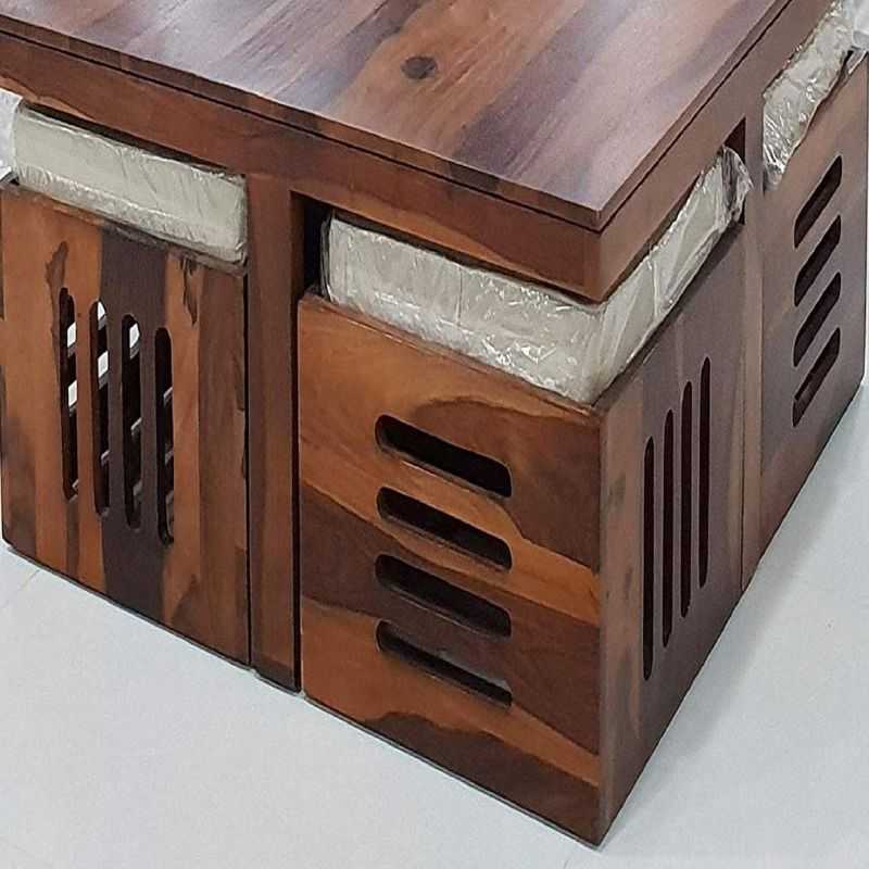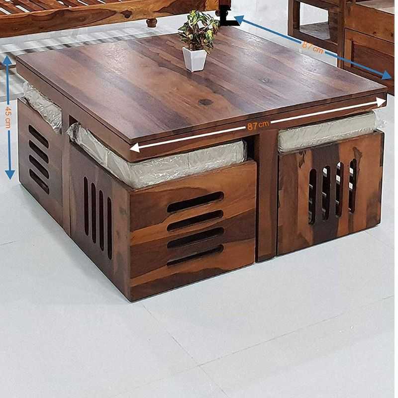 Transform your living space with this handcrafted solid Sheesham wood coffee table set, designed to combine elegance with everyday practicality. The square center table features a premium honey finish, paired with 4 integrated cushioned stools that double as storage boxes. A perfect pick for modern apartments, luxury villas, or compact homes seeking functionality with charm.