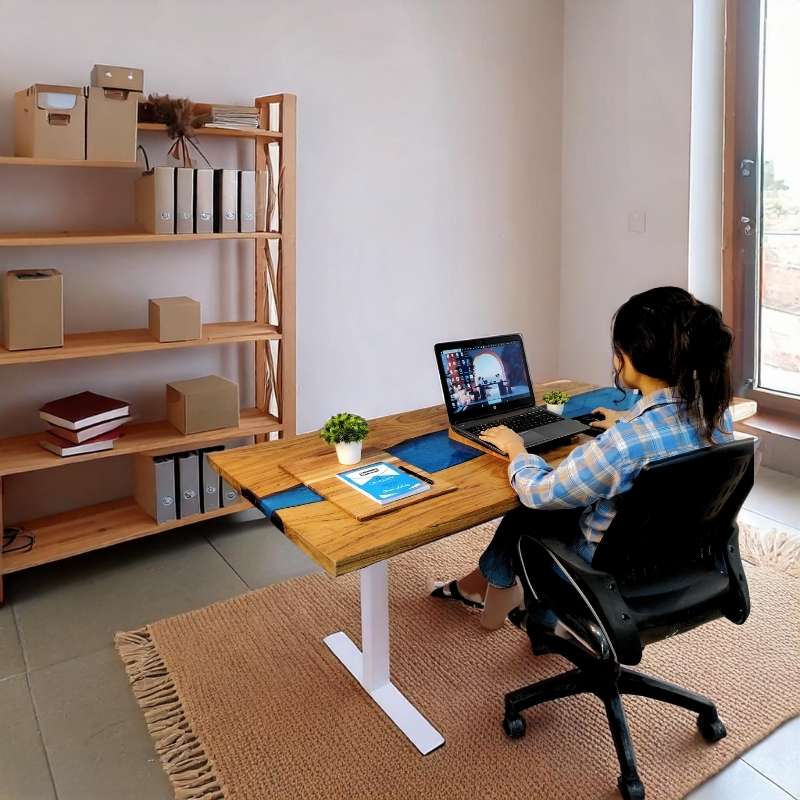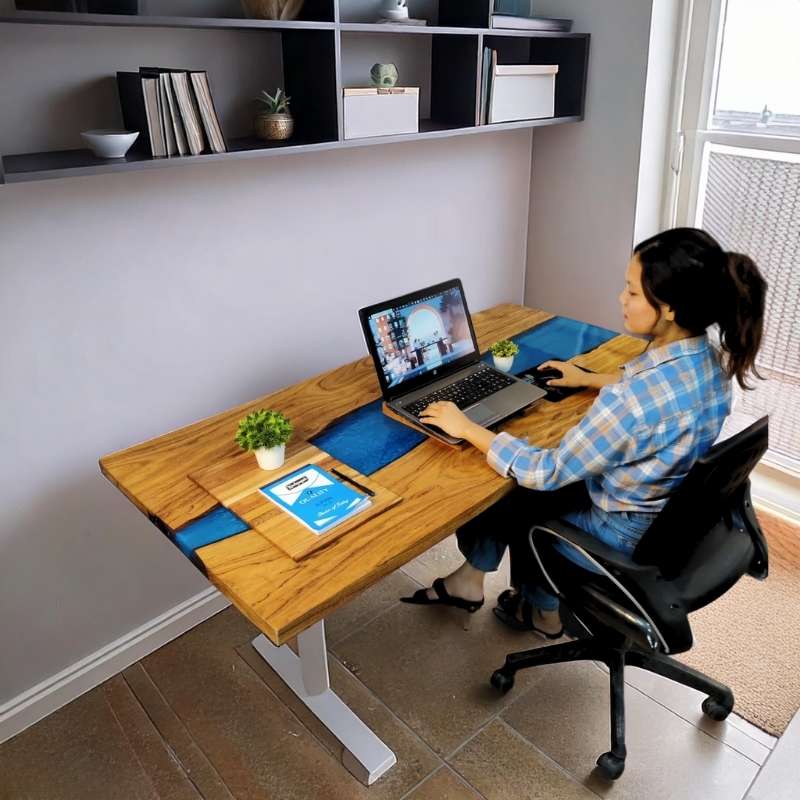 This Height Adjustable Desk, a 48-inch pearl blue epoxy wood table with a height adjustment option, is equipped with an electric motor that helps in adjusting height in no time. Electric sit & stand desk that is stylish, functional, and affordable. Crafted Options are available in solid wood. The Up & Down Ergonomic Table has different designs and color and a metal frame, this pearl blue height adjustable table is beautifully eye-catching and serves as a functional to complement your work environment for office and home needs.