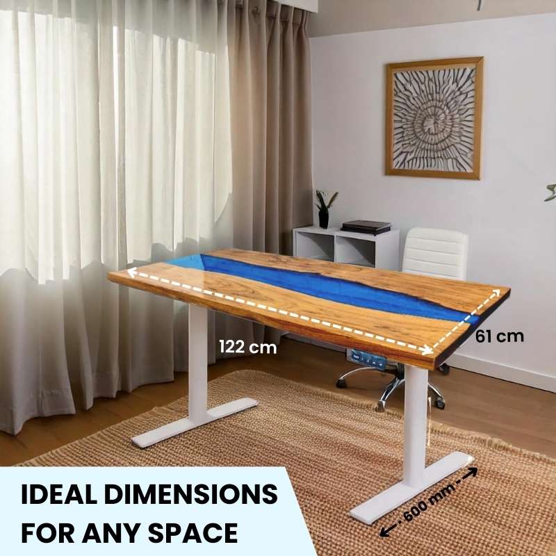 The perfect form and function of a height adjustable desk with a pearl blue epoxy wood top that has a look of a river adds to its aesthetic appeal. The structure of this desk reflects the pearl blue epoxy finish with the river design giving it the ultimate beauty and inspiring working environment..