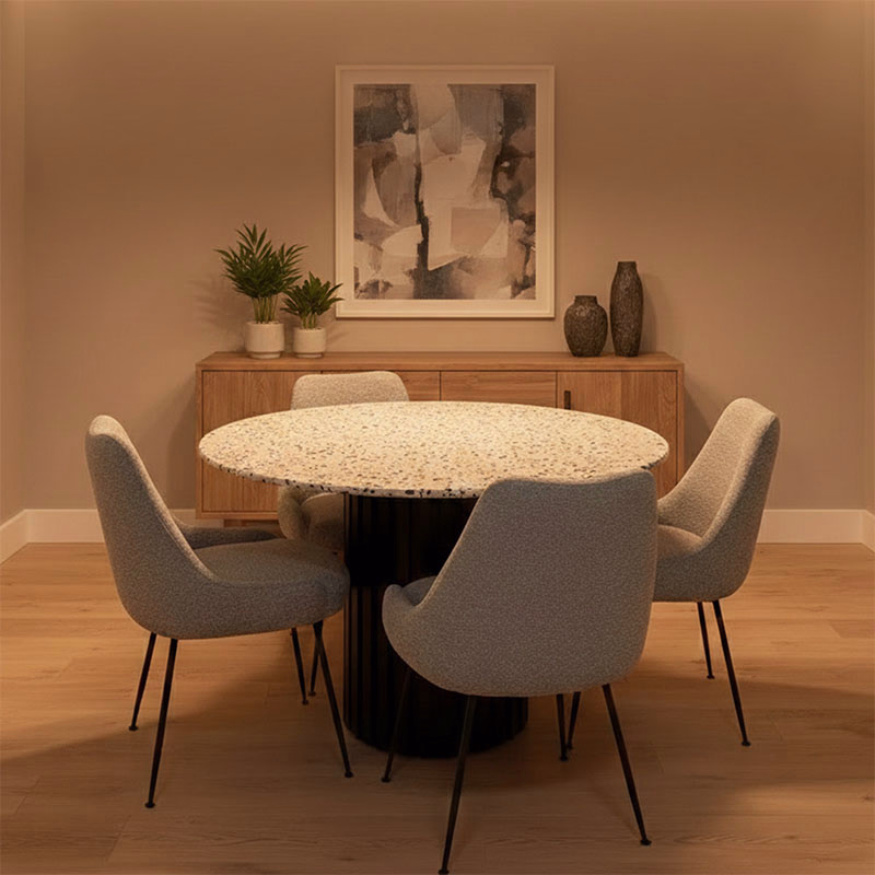 Elevate your dining space with the TerraForma dining table, a sophisticated blend of modern design and natural materials. Featuring a premium terrazzo dining table top, this 4-seater design combines durability with timeless style. Each stone dining Terrazo table is unique, showcasing subtle speckled patterns that complement its solid mango wood base, crafted for stability and elegance.