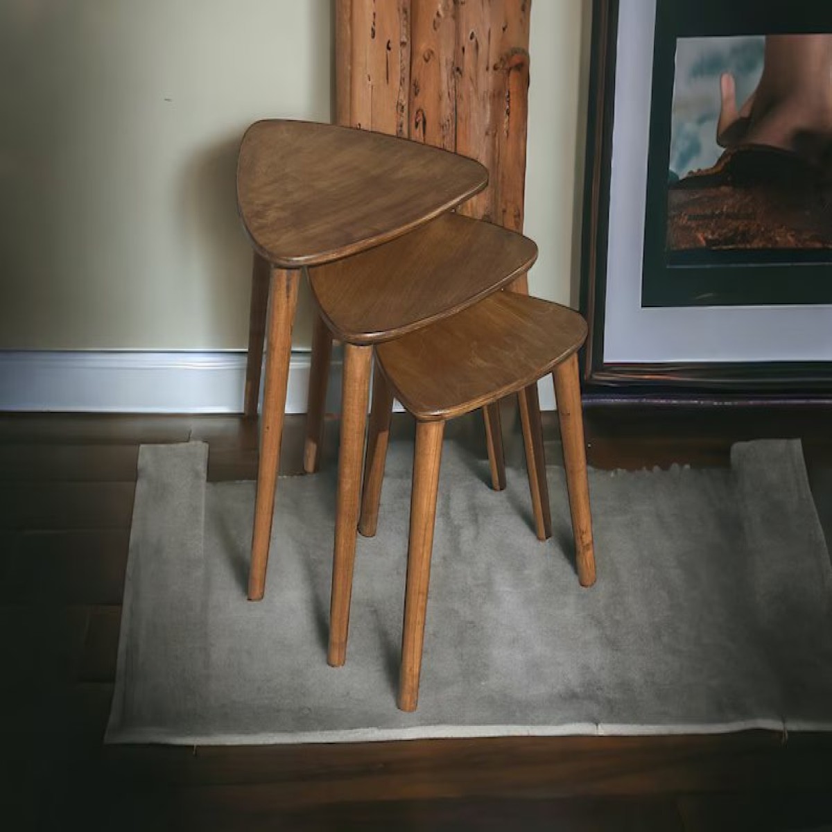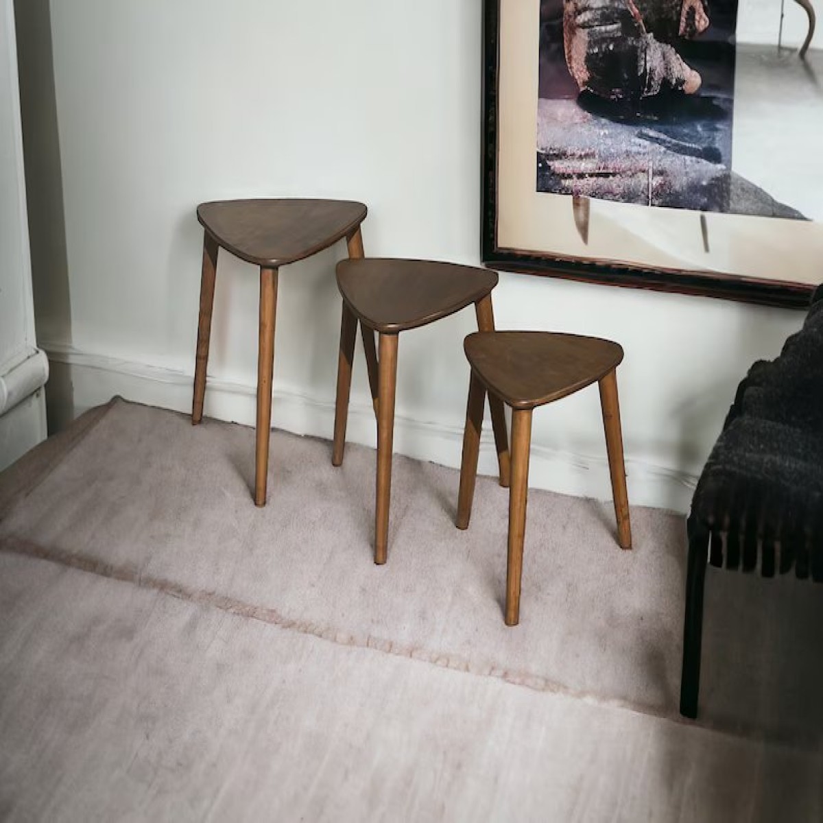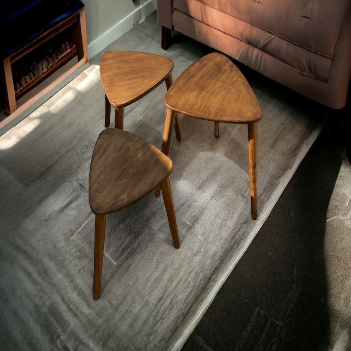 The triangle shape of the these nesting tables gives them a distinctive look; they go with any home decor, bringing the modern and latest flavour into the interior. The wooden material brings in the nature's tone, which results in the warm and attractive design of your space and causes the creation of a snug and welcoming environment.