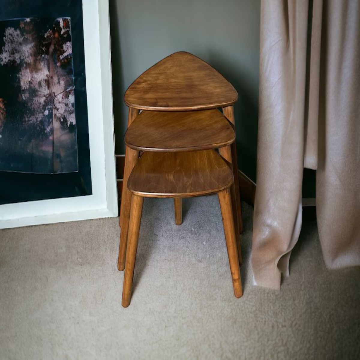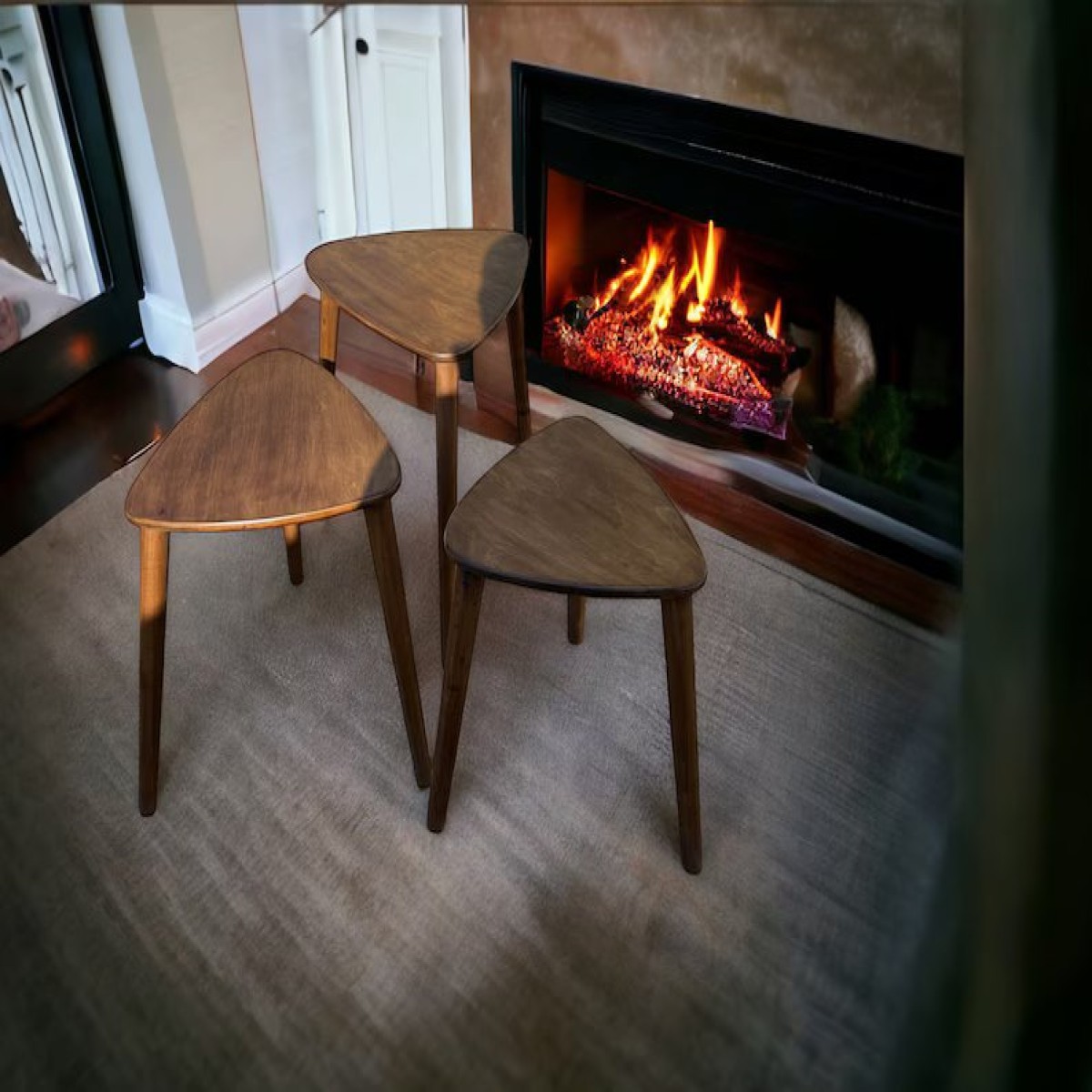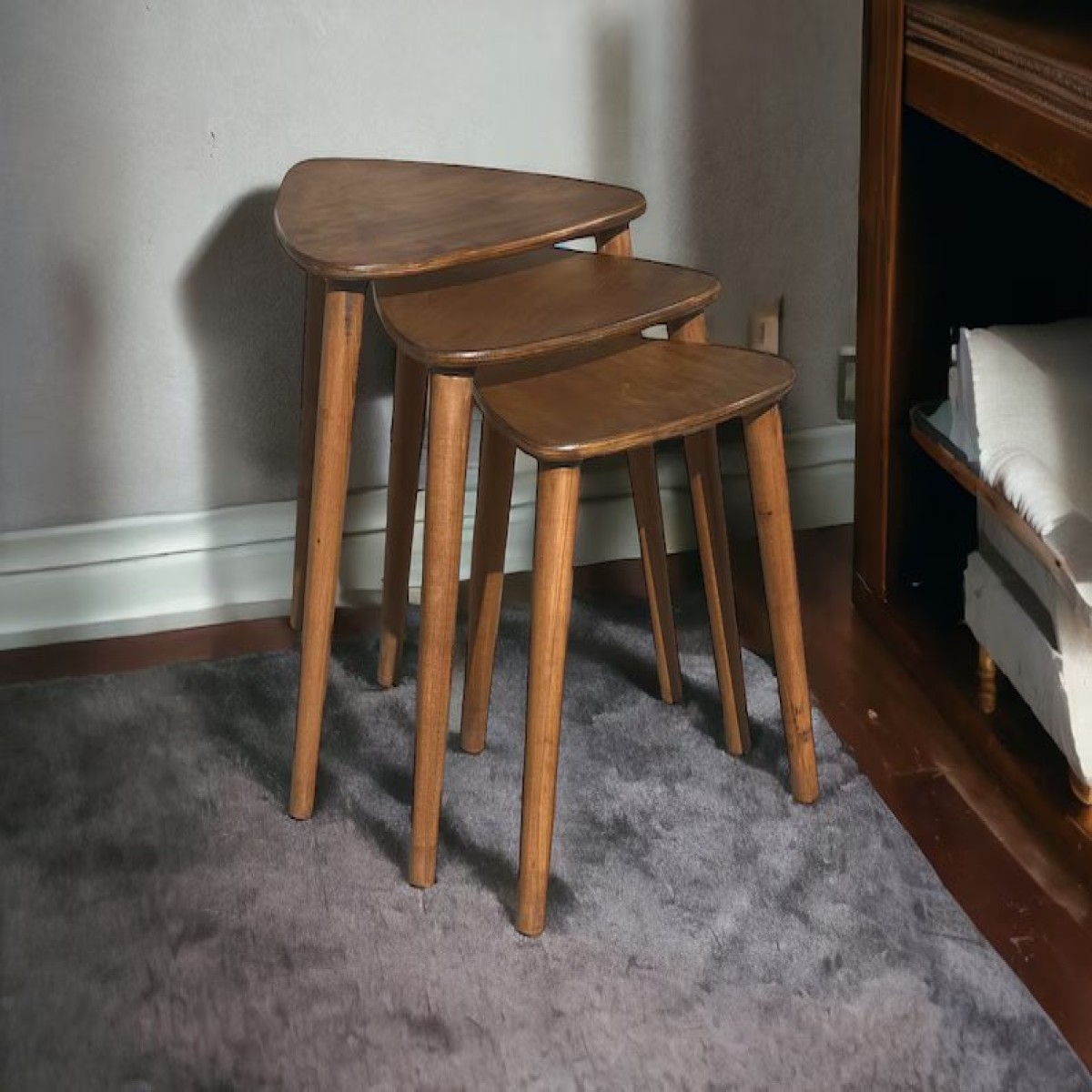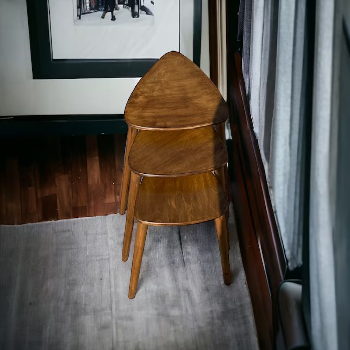 The triangle shape of the these nesting tables gives them a distinctive look; they go with any home decor, bringing the modern and latest flavour into the interior. The wooden material brings in the nature's tone, which results in the warm and attractive design of your space and causes the creation of a snug and welcoming environment.