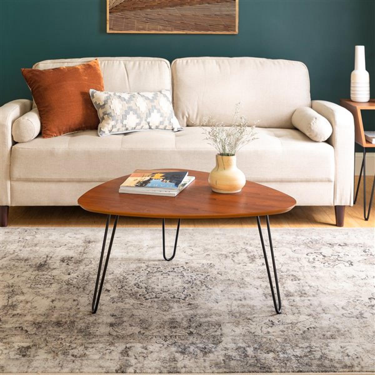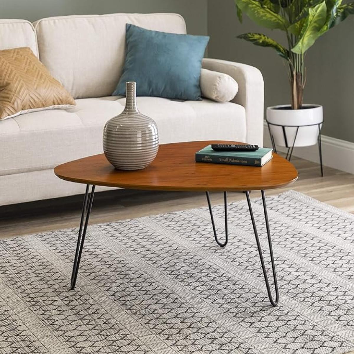 TriPin Coffee Table is a modern work of art in coffee table form, with its sleek and practical lines. Minimalist Pin-Coffee table: This pin coffee table brings contemporary furniture with a unique triangle shape and hairpin legs. This elegant product is perfect for all homes or offices and will bring a touch of sophistication as a focal point to numerous interior designs. An important aspect of the TriPin Coffee Table design is its construction from high-quality materials that result in durability and elegance. Its geometric shape gives it a strong posture and the hairpin legs bring a Mid Century Modern feel. This Wrought Iron Coffee Table is available in different finishes and could improve the aesthetic and functionality of your room.