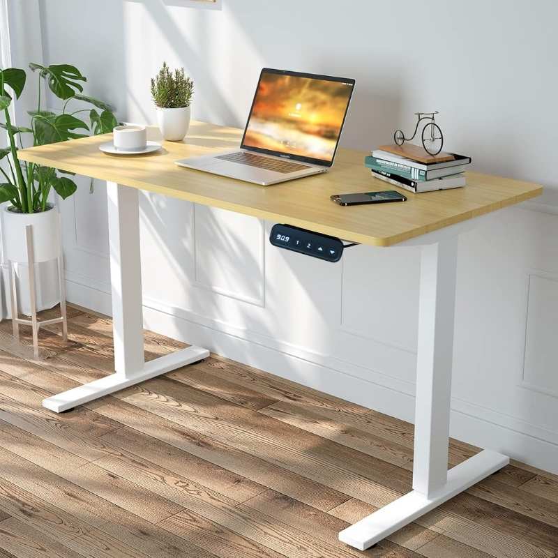 Probably one of the most effective and chic solutions is a standing desk with a cream-engineered wood top. The cream-engineered wood tabletop has that smooth, fuzzy, and welcoming feel, which is appropriate for any combination of home decor themes. Further, it is wear-resistant and does not scratch easily, it is also easy to clean.