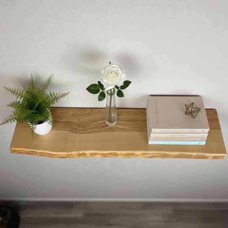 A live edge floating shelf is a wall-mounted wooden shelf that retains the natural edge of the wood, giving it a rustic and organic look. It's designed to appear as if it's "floating" without visible brackets or supports.