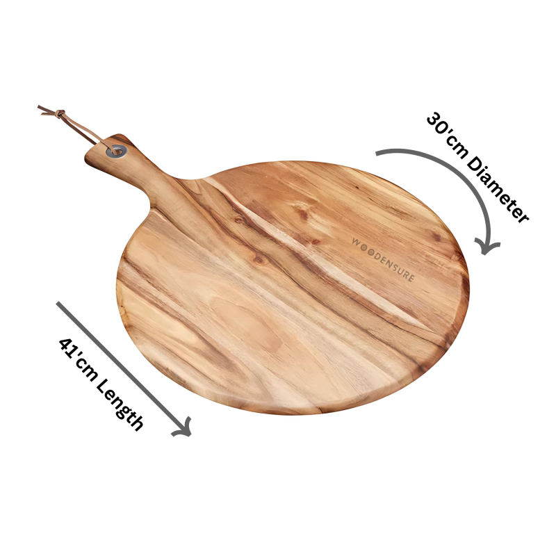 The round paddle shape not only provides a practical grip but also allows the inherent beauty of the acacia wood to take center stage. Crafted from high-quality acacia solid wood, this chopping board is a key piece for your kitchen, ensuring durability and an appealing aesthetic.