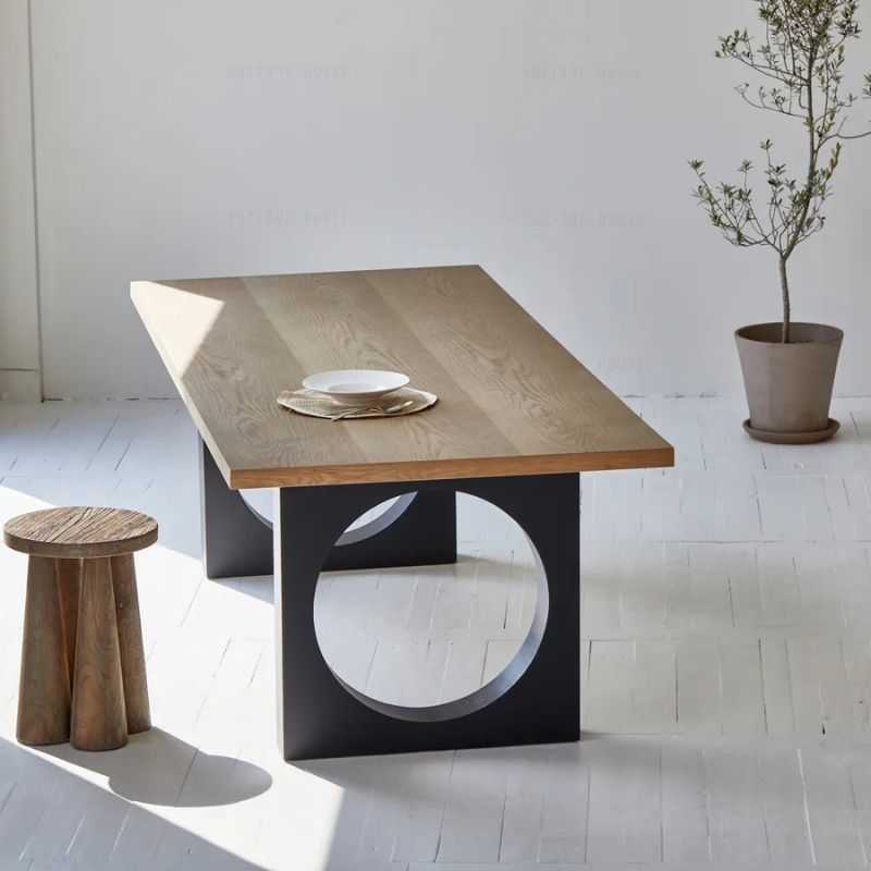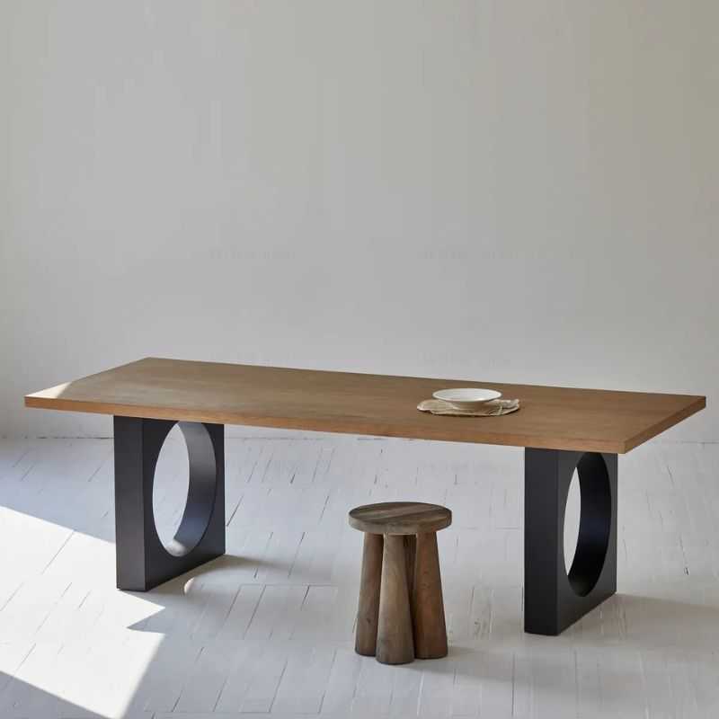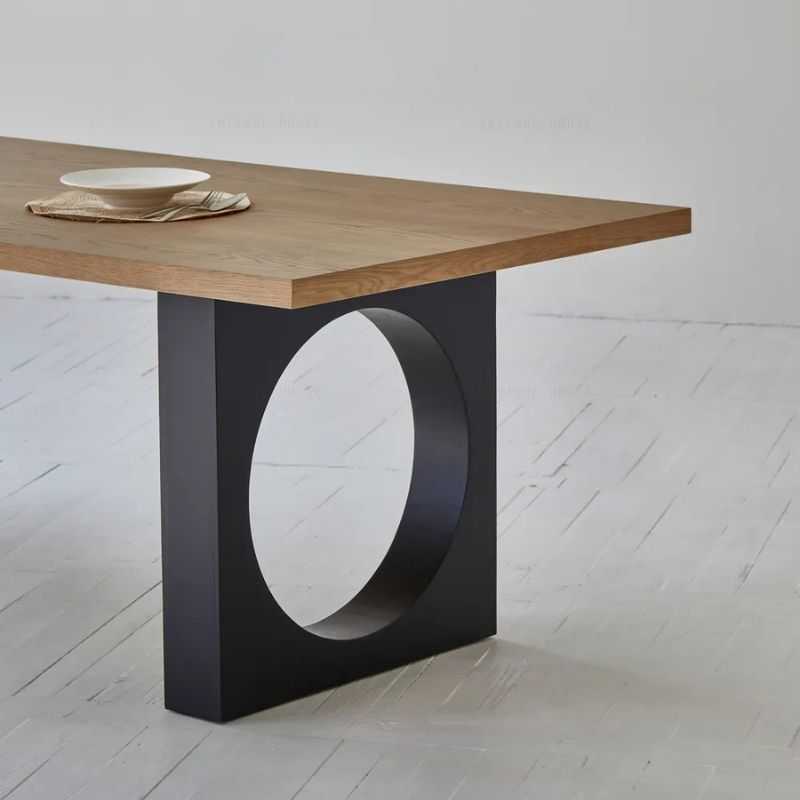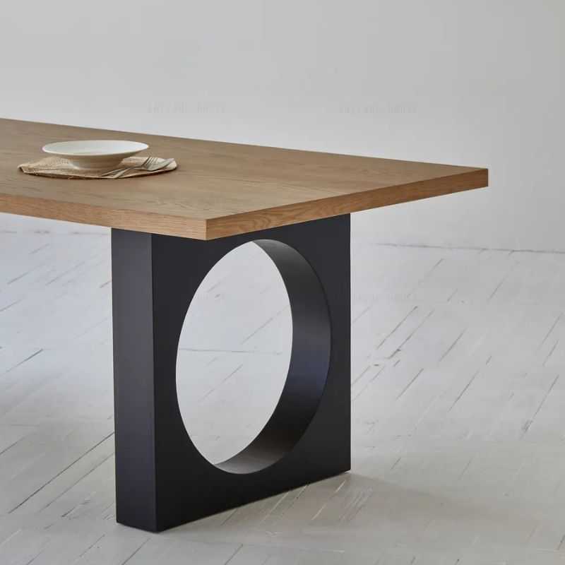 Bold Circular Cutout: Unique geometric design enhances modern dining aesthetics.