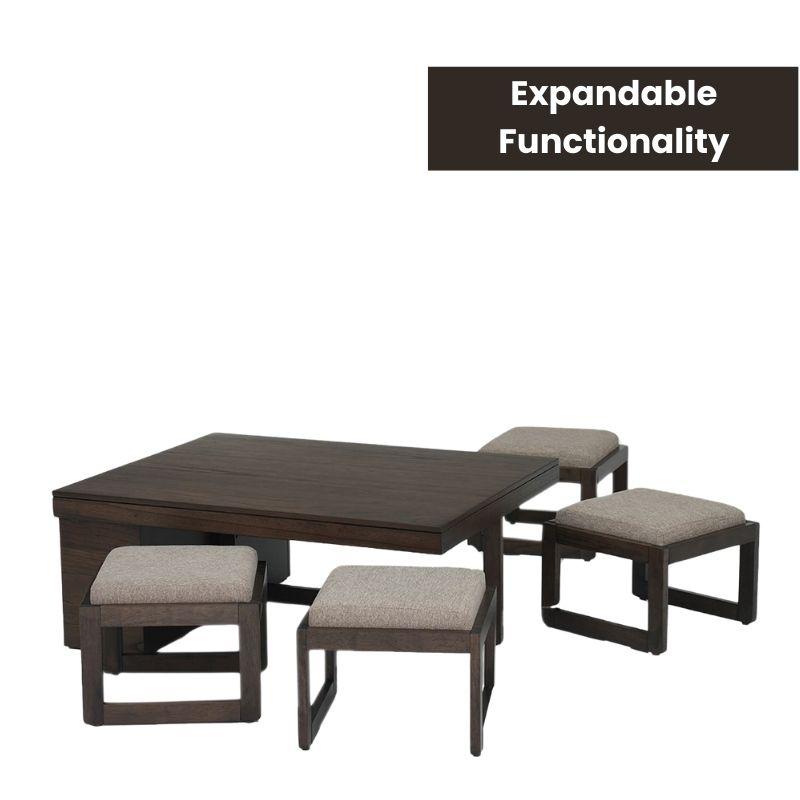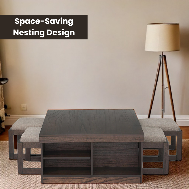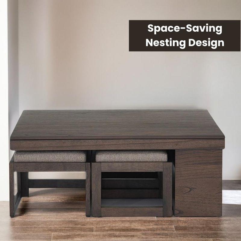 What makes Nestin truly unique is its multi-functional design: a sturdy tabletop with four upholstered stools that tuck away neatly underneath. Whether you're hosting a game night, serving snacks, or simply needing extra seating, this center coffee table set has you covered. The rich walnut finish complements both light and dark interiors, making it a versatile piece for modern living rooms, studio apartments, or even compact balconies.